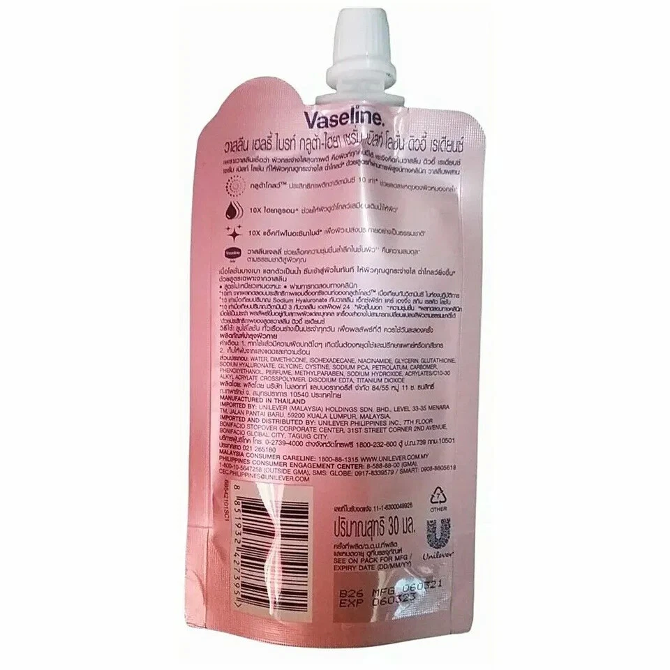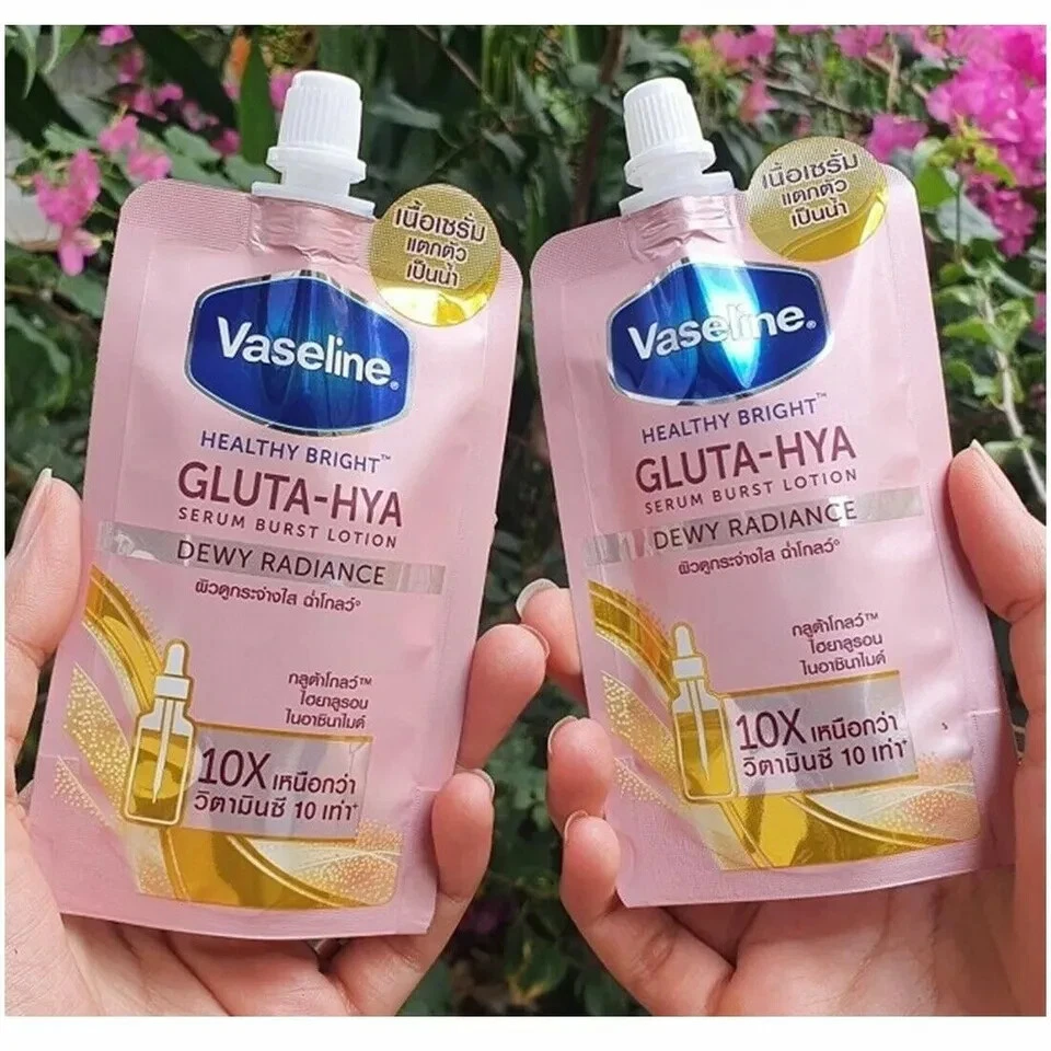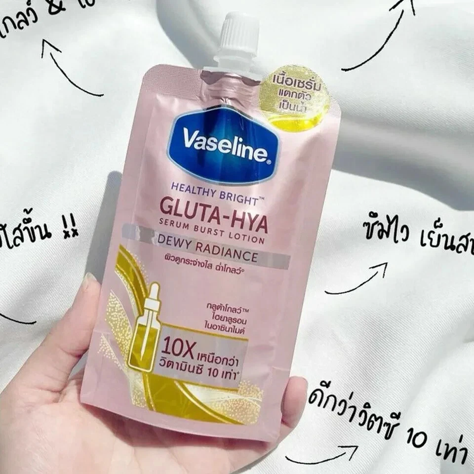 Apply Vaseline® Healthy Bright Gluta-Hya Serum Burst Lotion to your hand and spread across your body until absorbed. Use twice a day for best results. Apply thoroughly to avoid product rubbing off on clothes.