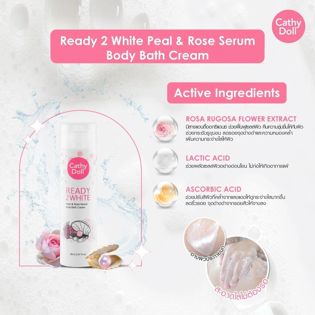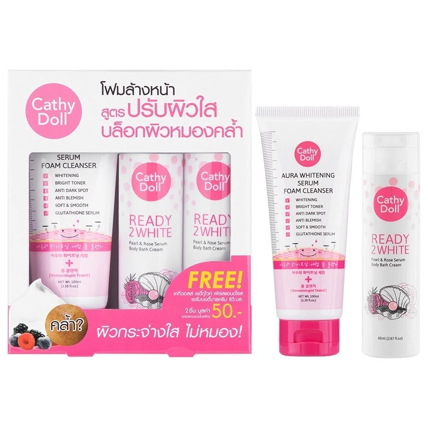 Description: Aura Serum Foam 100ml + Pearl and Rose Body Bath Cream 85ml 1pc + 1pc FREE Rose Body Bath Cream 85m 1. Cathy Doll Aura Whitening Serum Foam Cleanser 100ml Combining serum to wash your face that comes with nourishment. Helps reduce and prevent dark spots to make your face white, clear, glowing like aura. Ready to provide softness and smoothness to the touch. How to use: Squeeze the foam onto the palm of your hand, rub gently over the face and rinse. 2. Cathy Doll Pearl and Rose Serum Body Bath Cream 85ml 2 pieces Combining the effectiveness of pearl powder and rose water Helps to remove dead skin cells and gently cleanse the skin. But it does not dry out the skin, it also helps to reduce dullness, slow down the aging of time and maintain moisture to the skin. How to use: Squeeze a moderate amount of shower cream onto the palm. Use to scrub the body while the skin is wet. Then rinse with clean water . Should be used continuously