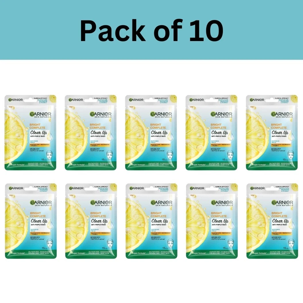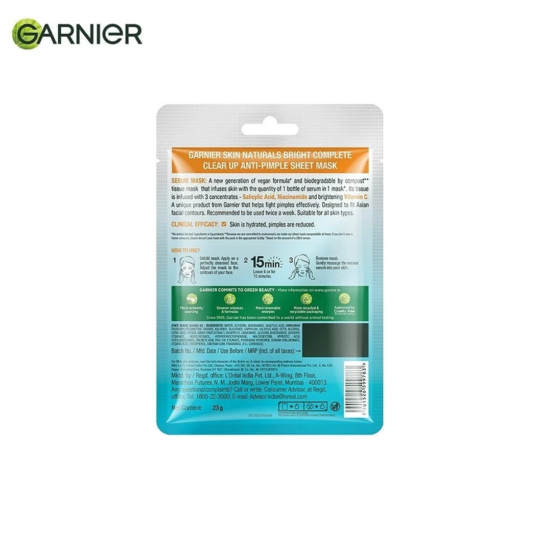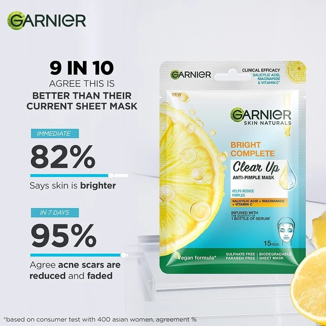 Garnier Bright Complete Anti Pimple Sheet Mask -Infused With Power of 3 serums, Salicylic Acid, Niacinamide and Vitamin C Serum,Face Sheet Mask For Clear, Hydrated And Glowing Skin, for All Skin Types