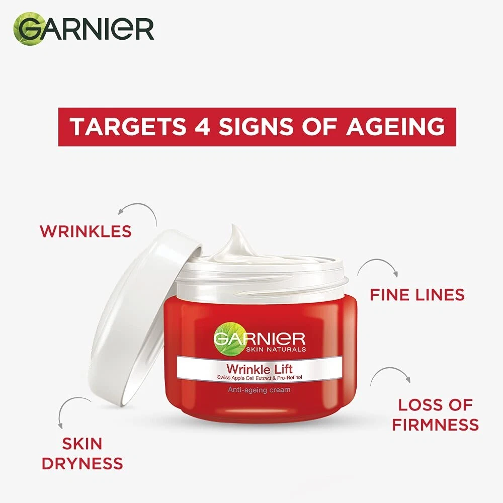 It does more than a classic anti-wrinkle cream: Garnier Wrinkle Lift Anti-ageing Cream has been designed to reduce wrinkles and put spring and vitality back into your skin, recovering lost firmness and elasticity. Its formula contains a unique combination of pure natural active ingredients.