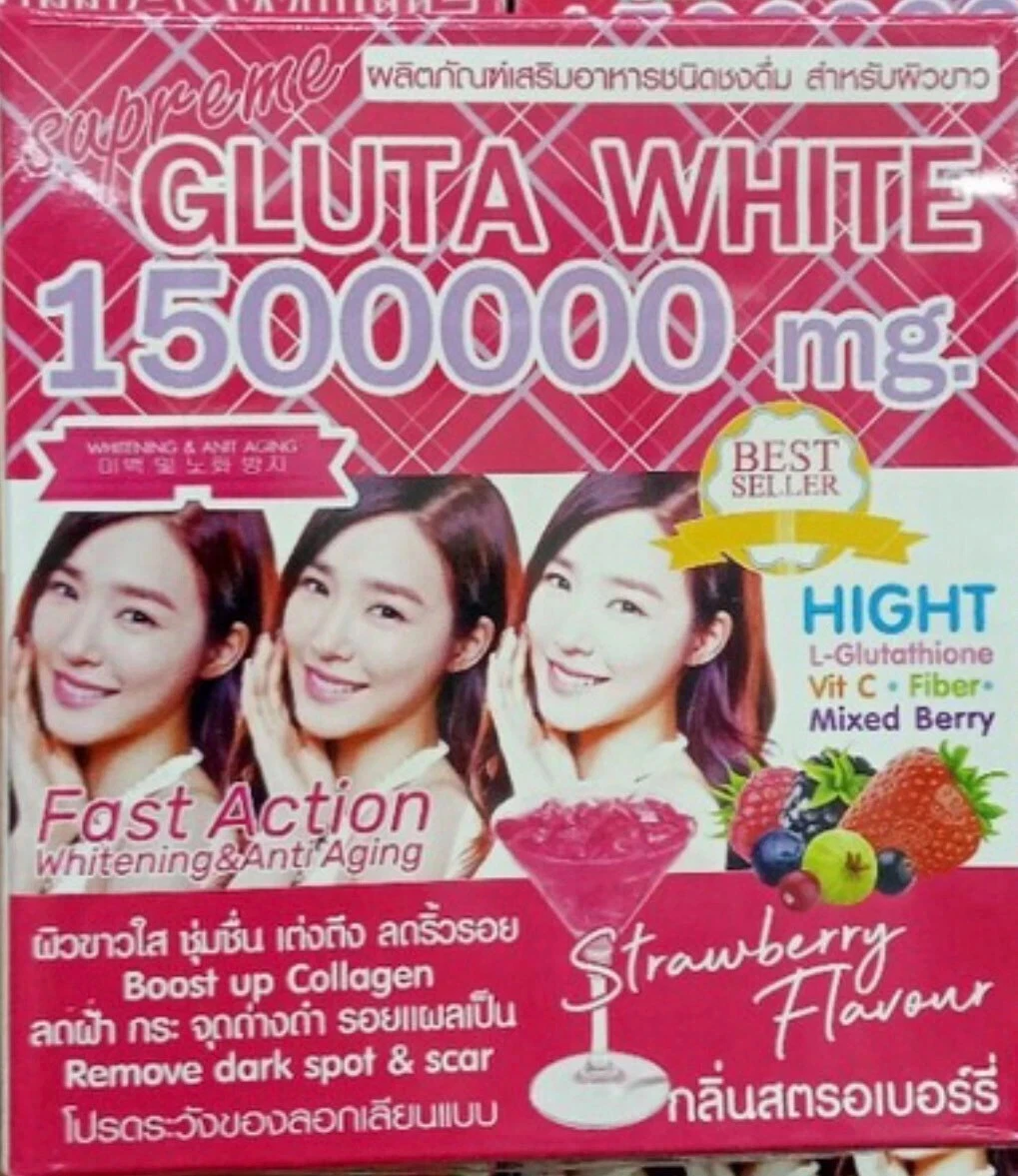 Supreme Gluta white 1500000 mg Punch drink to increase energy, white aura, white rice, blemishes, freckles, dark spots and absorb quickly, not dangerous, white peak, white skin, firm berries, glutathione 15000000 mg. Mix collagen up to 10,000 mg of berry fruit extracts which provides a large amount of antioxidants Skincare. Just 1 box, you will get white and clear skin. Collagen stimulation reduces premature aging removes dark spots and scars, and tightens pores, healthy skin, hair, and nails dissolve 1 sachet in cold water.