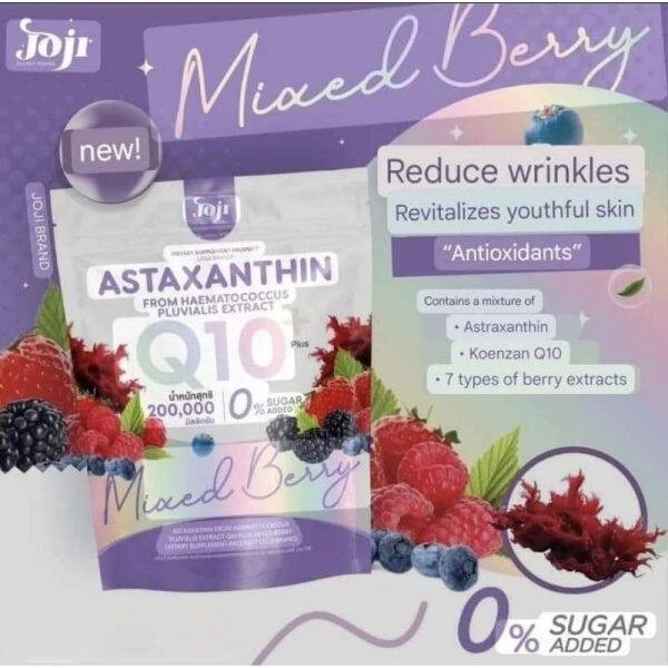 "Joji Secret Astaxanthin Q10 Young Gluta Collagen DTX Plus" appears to be a dietary supplement aimed at promoting clear skin and overall skin health. Here's a breakdown of the key ingredients and their potential benefits: