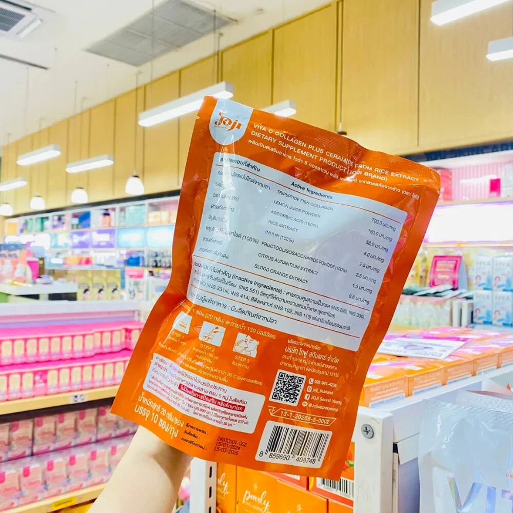 Joji Secret Young Vita C Collagen Plus Ceramide from Rice Extract 10's, in powder form with Ceramide from Rice Extract flavour which contains a mixture of Glutathione, Collagen from Marine Fish and Citrus Fruit Extract Powders such as Strawberries, Raspberries and Blackcurrants.