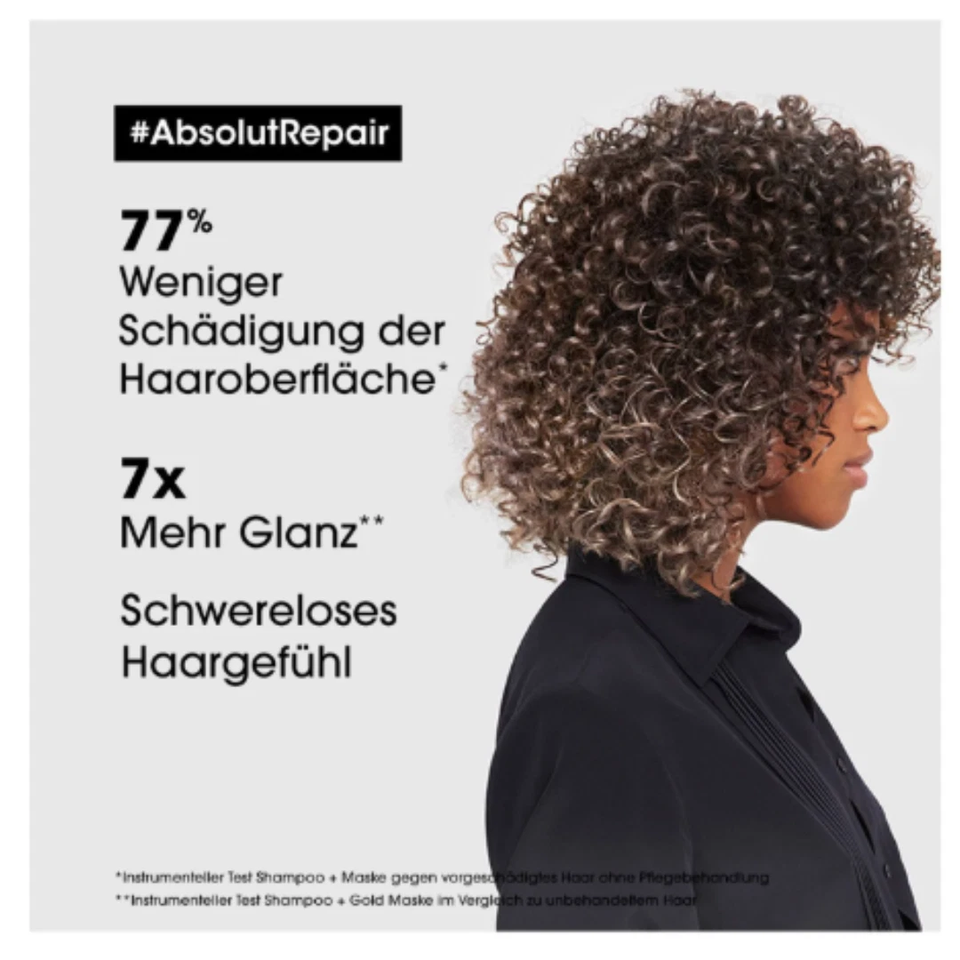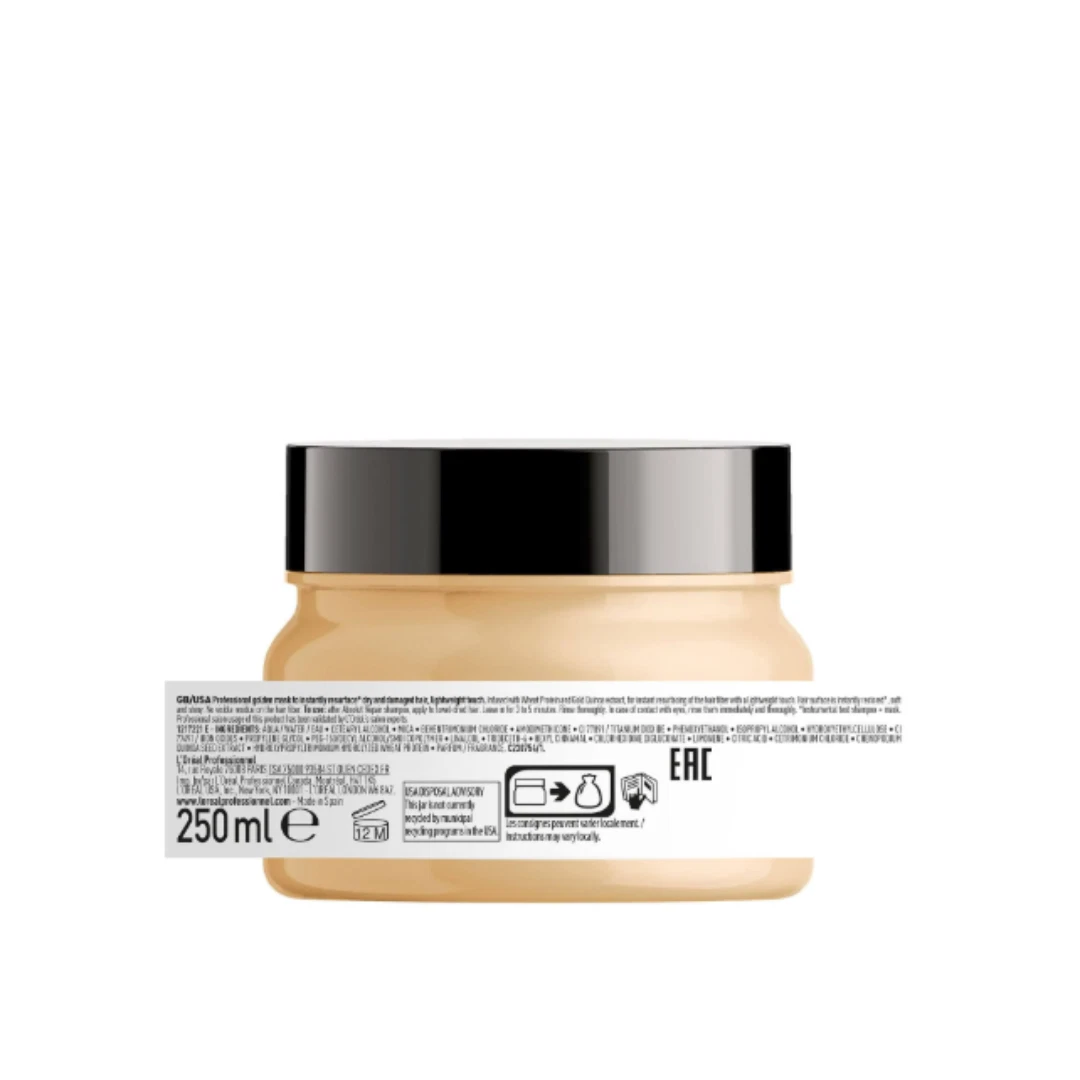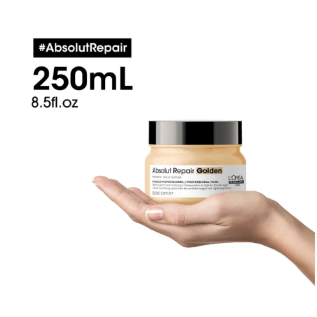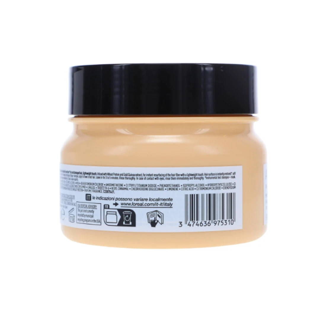 L'Oréal Professionnel Série Expert Absolut Repair Golden Mask is a hair mask specifically developed for very damaged hair. It is particularly beneficial for those with fine to medium hair types in need of restoration. The professional formula, enriched with gold quinoa and protein, not only repairs the hair but also offers protection against further damage. Moreover, the co-emulsion technology used in this formula allows for deeper penetration of the active ingredients. Therefore, this mask can fill in micro-fissures in the hair, effectively resurfacing it for a healthier look. This technology also ensures that the repairing process will be efficient without weighing down the hair which is a common concern for those with thin hair types.