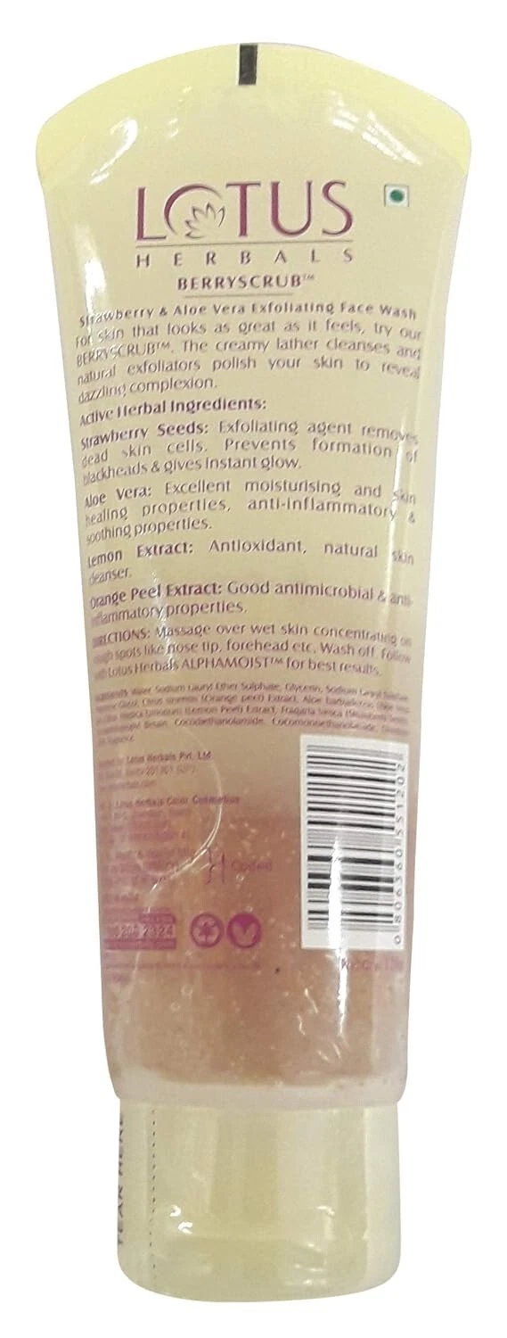 A clean and fresh looking face is what each of us desire for. Lotus herbal strawberry and aloe vera exfoliating face wash cleanses your skin thoroughly and adds a glow to your complexion.For skin that looks as good as it feels, try our scrub gel. The creamy lather cleanses and natural exfoliators polish your skin to reveal a glowing complexion. This product contains strawberry seeds which act as an exfoliating agent and help you get rid of dead skin cells. It will make your skin supple and soft to touch. The aloe vera extract has exceptional moisturising and skin curative properties. It not only acts as an anti-inflammatory but also as a skin soother. Together, they function as a perfect combination to treat all kinds of skin irritations.This face wash can be used by both men and women. It is suitable for all skin types.