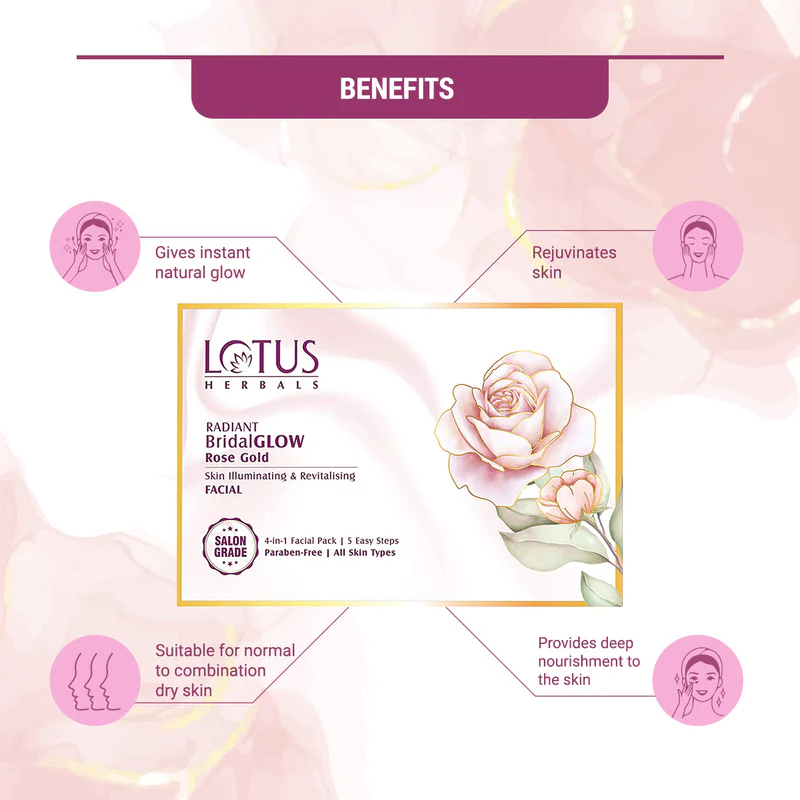 Look picture-perfect on your big day! Get a radiant, illuminating glow with this Lotus Radiant BridalGlow Facial. This luxurious facial with exotic Rose Oil & 24K Gold Leaves revitalises your skin and makes it younger looking. Step 1 Cleansing Gel: Gently removes makeup residue, pollutants and impurities from the skin and prepares it for the next step. Step 2 Micro Polisher: Scrub away the dead cells and loosen blackheads and whiteheads, giving smooth polished finish to the face. Step 3 Deep-Cell Activating Serum (with 24K Gold): This potent, natural actives enriched gel serum is a unique mix of Serum + Oil, it penetrates deeply into the skin and helps making it rejuvenated and radiant from within. Step 4 Illuminating Facial Crème: An ultra-rich facial crème smoothen the skin and help carry the natural actives deep inside the epidermal layer to provide nourishment, firmness and golden glow. A relaxing massage helps improve blood circulation and lymphatic drainage of the skin. Step 5 Algae Peel-off Mask: This peel-off rubber mask is highly recommended for tired and dull looking skin. Its firming effect helps reduce the puffiness on the face and leaves the skin perfectly moist and glistening.