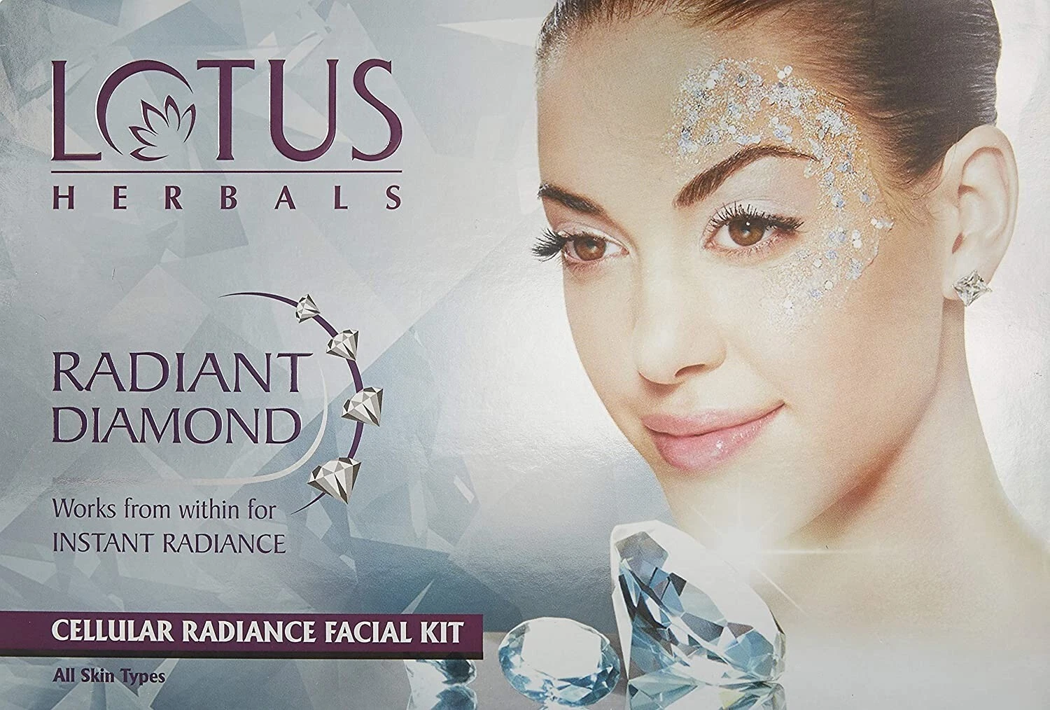 "Lotus Herbals Radiant Diamond Deep-Cell Activation System Cellular Radiance Facial Kit is the combination of organic and natural items which rejuvenates the skin with cellular regeneration with deep cell activation system. It consists of radiant diamond exfoliating cleanser that consists of diamond dust and natural extracts. Another item present in the kit is radiant diamond activator which penetrate in the skin with diamond colloidal and promotes collagen production and fights with free radical damage. It also consists of Radiant diamond Massage Cream With diamond dust that helps wrinkles to get vanished and maintains skin firmness and muscle toning. The useful radiant diamond mask that rinses the dirt from the face and give you a glowing skin. This kit is clinically verified by dermatologists for their mildness on skin. Rejuvenate and glow your skin with Lotus Herbals Radiant Diamond Deep-Cell Activation System Cellular Radiance Facial Kit. "