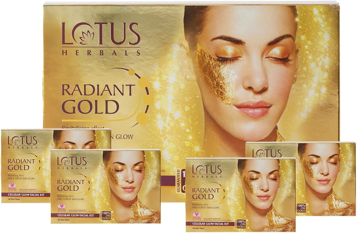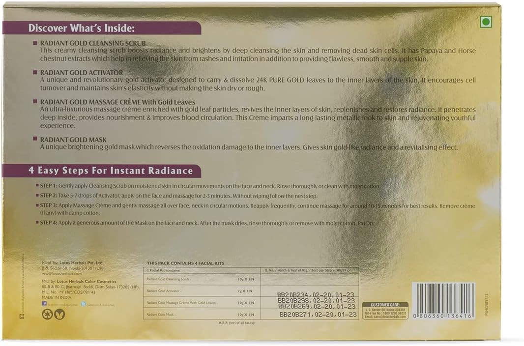 Glow With A Touch Of GoldLotus Herbal Radiant Gold Cellular Glow Facial Kit is just what you need when you want to look spectacular in minutes. This compact, easy-to-use facial kit contains 24K Gold leaves, papaya and horse chestnut extracts which make stimulate cell growth, to revitalize your skin and make it look and feel younger. The gold leaves restore and replenish your skin’s natural glow to make your look enviously radiant in no time! Step 1 | Radiant Gold Exfoliating CleanserThis exfoliating cleanser is boosted with papaya and horse chestnut extracts which gently cleanse your skin off dead cells and remove dirt, grime and excessive oils. The natural astringents in this cleanser soothe, irritated skin and distress it.Step 2| Radiant Gold ActivatorThis activator contains 24Karat Gold Leaves extract which dissolve into your skin and stimulate skin cell renewal to improve skin elasticity without making it rough or dry. This activator tightens and firms your skin making it look younger.Step 3| Radiant Gold Massage Cream With Gold LeavesEnriched with gold leaf particles this massage creams absorbs easily into your skin to revive inner layers of your skin. This helps restore and replenish the natural radiance of your skin. This massage cream penetrates deep into your skin cells to improve blood circulation which imparts a glow to your skin.Step 4| Radiant Gold MaskThis specially formulated mask reverses the effects of oxidation on the layers of your skin and accelerates skin renewal to give you skin which looks healthy & gorgeously radiant.