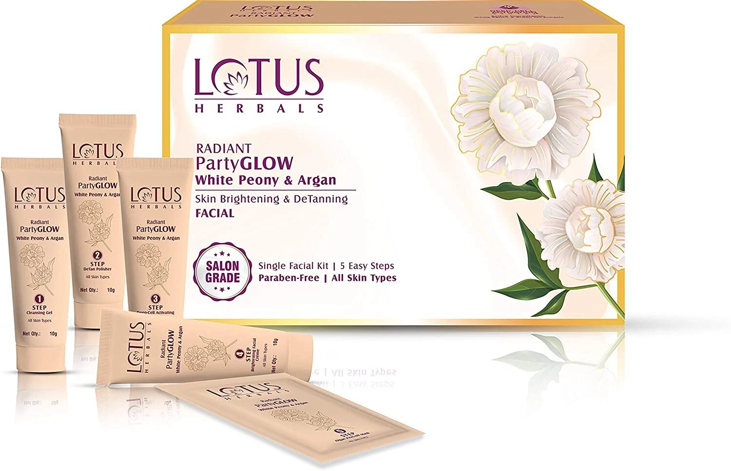 Get that party queen glow like a pro! Enriched with the goodness of white peony & argan oil, lotus radiant party glow facial brightens the skin from within. It lightens the dark spots and reduces the damage caused by the sun. How to use - step 1 cleansing gel: gently removes makeup residue, pollutants and impurities from the skin and prepares it for the next step. Step 2 de tan polisher: scrub away the dead cells and loosens blackheads and whiteheads, giving smooth polished finish to the face. step 3 deep-cell activating serum: this potent, natural actives enriched gel serum is a unique mix of serum + Oil, it penetrates deeply in to the skin, works on the dark spots, resulting in bright and translucent skin. Step 4 brightening facial crème: an ultra-rich facial crème smoothen the skin and help carry the natural actives deep inside the epidermal layer to provide even-toned, lighter complexion. A relaxing massage helps improve blood circulation and lymphatic drainage of the skin. Step 5 algae peel-off mask: this peel-off mask re-sets the tired, dull looking skin. Its firming effect helps reduce the puffiness on the face, and leaves the skin perfectly moist and glistening.