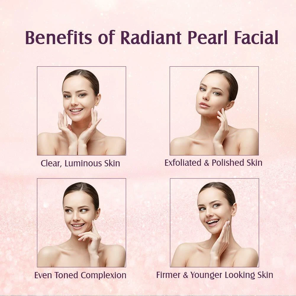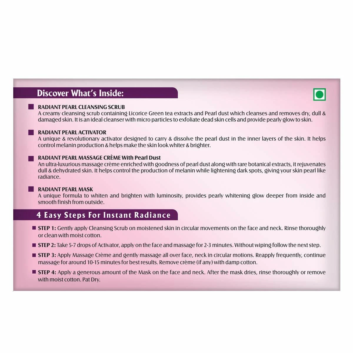 • Direction of Use: Step 1: Gently Apply Radiant Pearl Exfoliating Cleanser on moistened skin in circular movements on the face and neck. Rinse thoroughly or clean with moist cream.Step 2: Take 5-7 drops of Radiant Pearl activator, apply on the face and massage for 2-3 minutes. Step 3: Apply Radiant Pearl Massage creme and gently massage all over face, neck in circular movements. Reapply frequently, continue massage for around 10-15 minutes for better results. Remove from damp cotton.