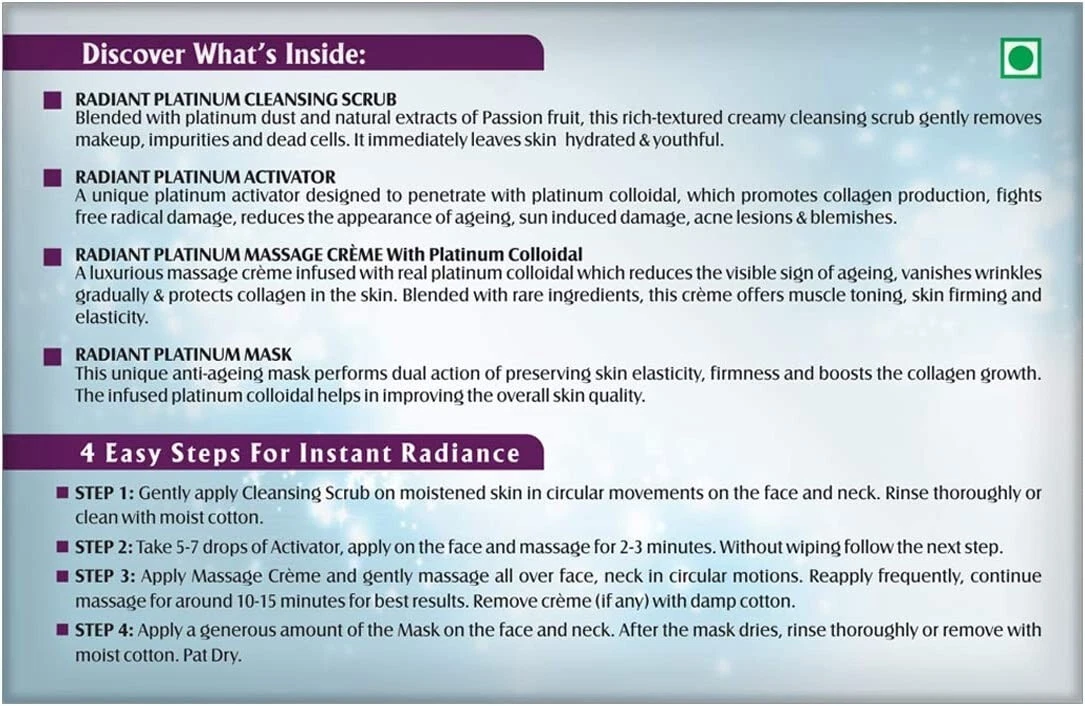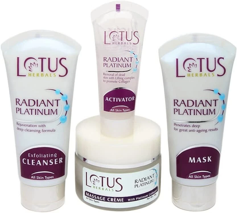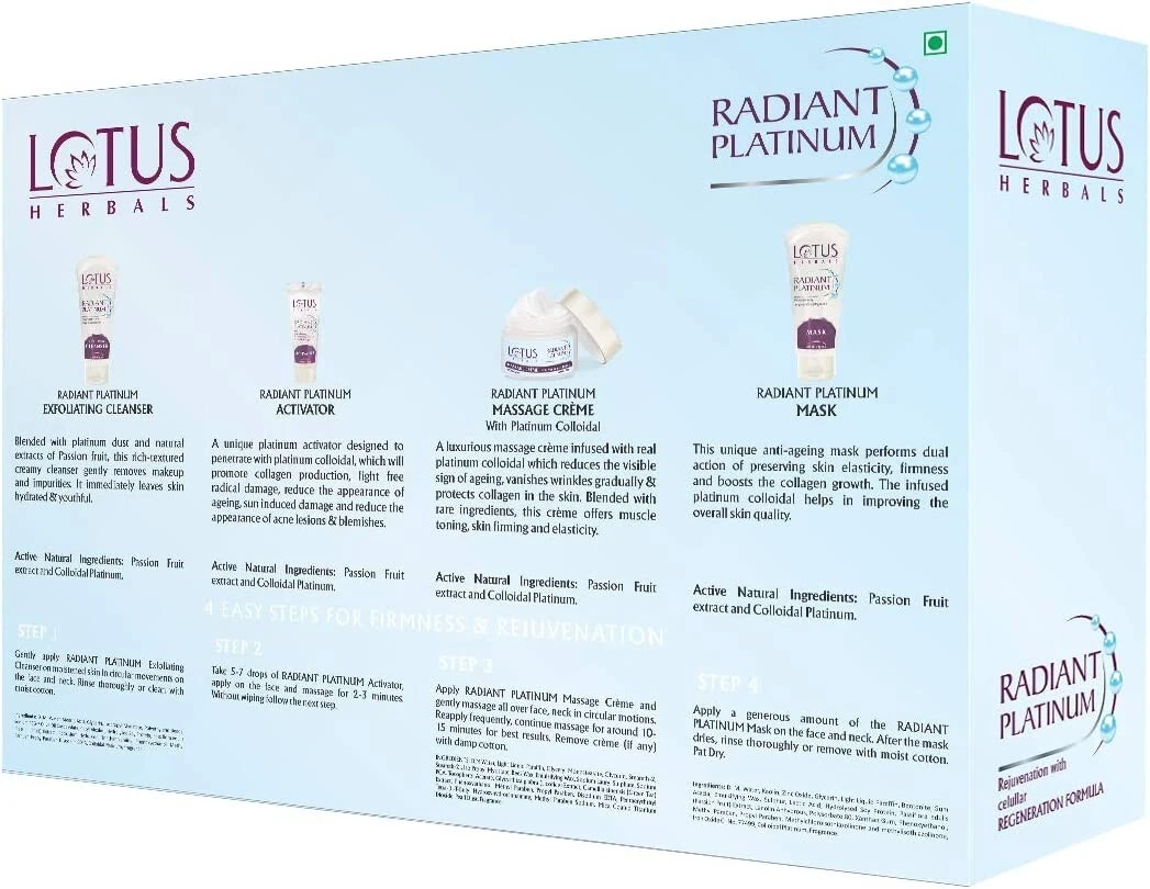 Lotus herbal introduces its top notch RADIANT PLATINUM Cellular Anti-Ageing 1 FACIAL KIT, which is a single use facial kit and comes in a sachet that includes Radiant Platinum Exfoliating Cleanser, Radiant Platinum activator, Radiant Platinum Massage Creme and Radiant Platinum Mask, which give you a tantalizing glow with a dreamy softness.