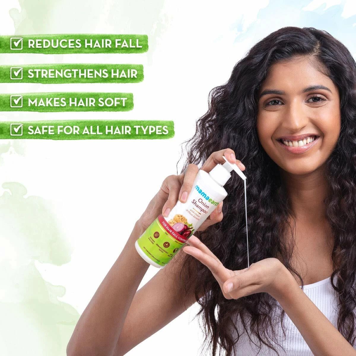 Stress, pollution & unhealthy lifestyle choices can lead to many hair troubles, hair fall is the most common one. Mamaearth's Onion Hair Shampoo helps you combat that. Onion Oil, rich in Sulphur, Potassium, reduces hair fall & accelerates hair regrowth. Plant Keratin replenishes and strengthens hair, repairing its natural structure. It makes hair smooth & frizz-free. Safe for colored & chemically treated hair, this shampoo is free of harmful chemicals