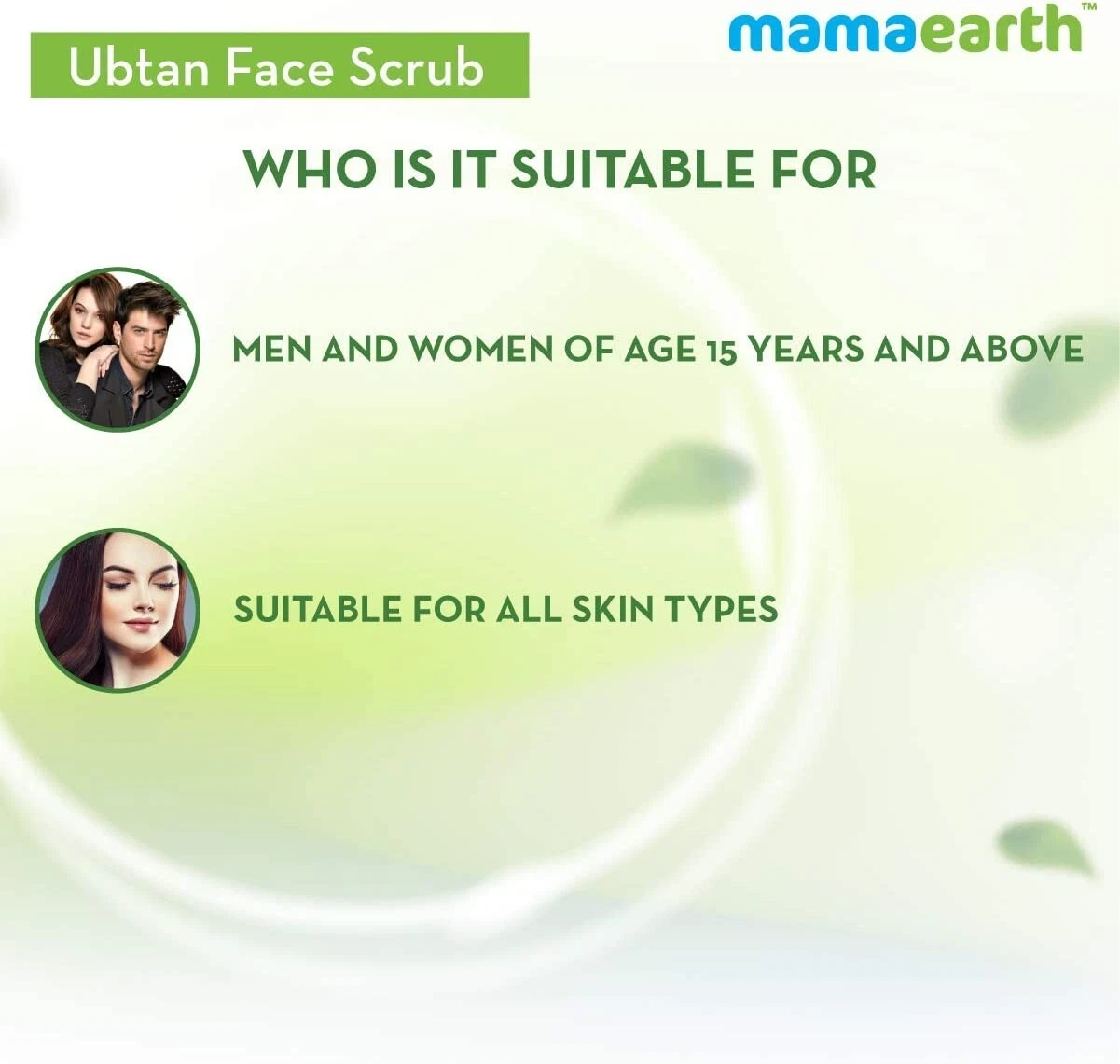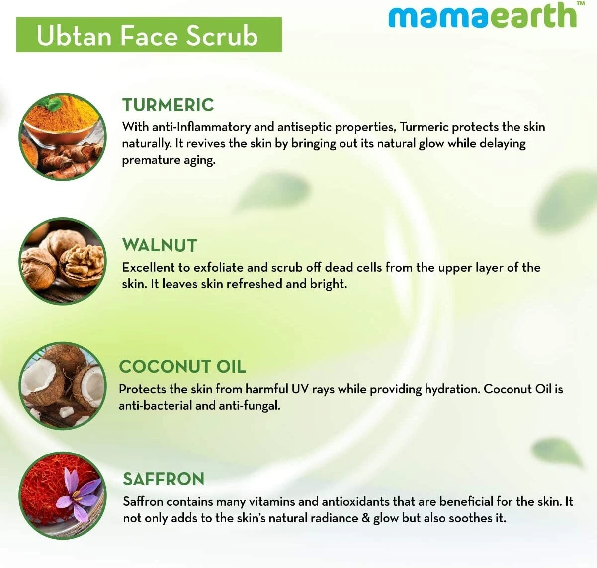 With BioactivesOur Ubtan Face Scrub is enriched with the goodness of Turmeric, Walnut beads, Coconut Oil, and Saffron. | Dermatologically TestedAll Mamaearth products go through strict testing to ensure they are absolutely safe for use. | Paraben & Silicone FreeAll our products are completely free of Parabens and Silicones that may cause hormonal changes in the body. |