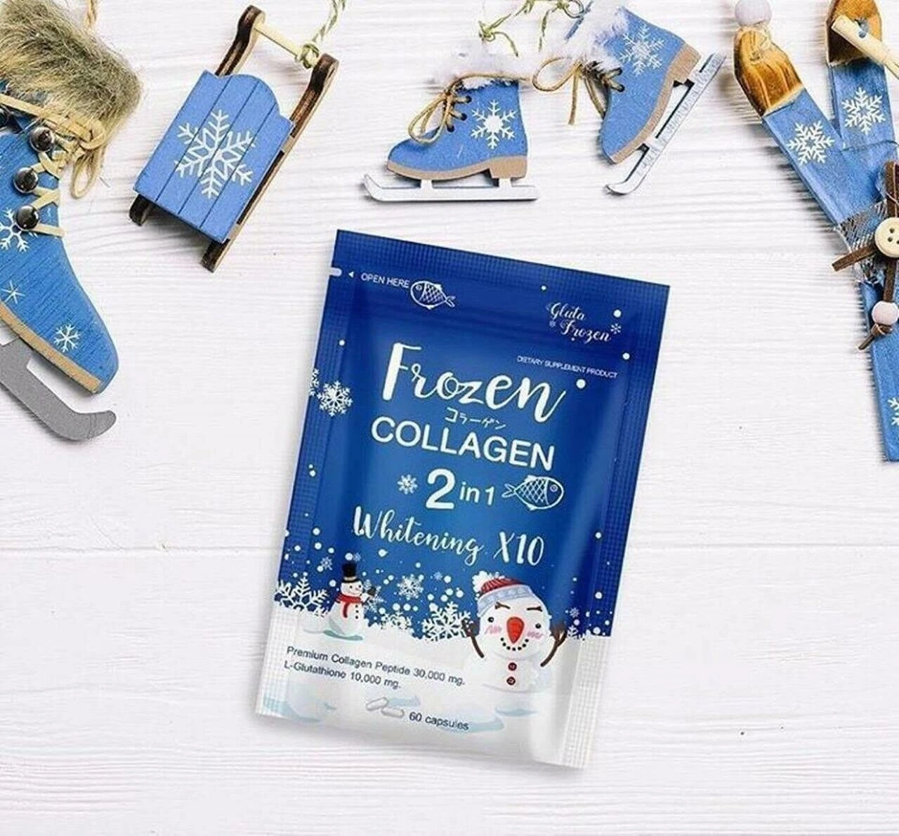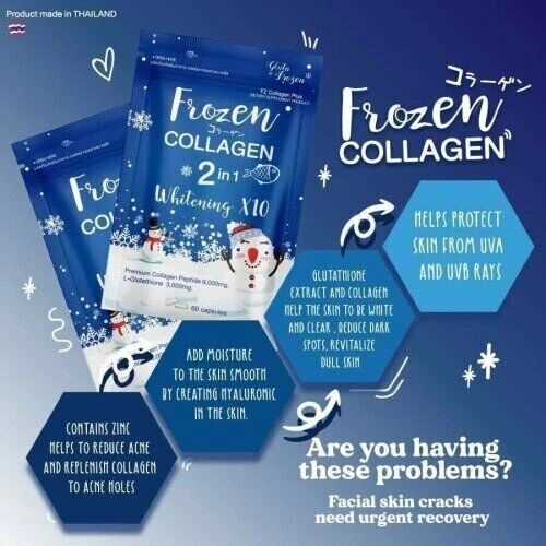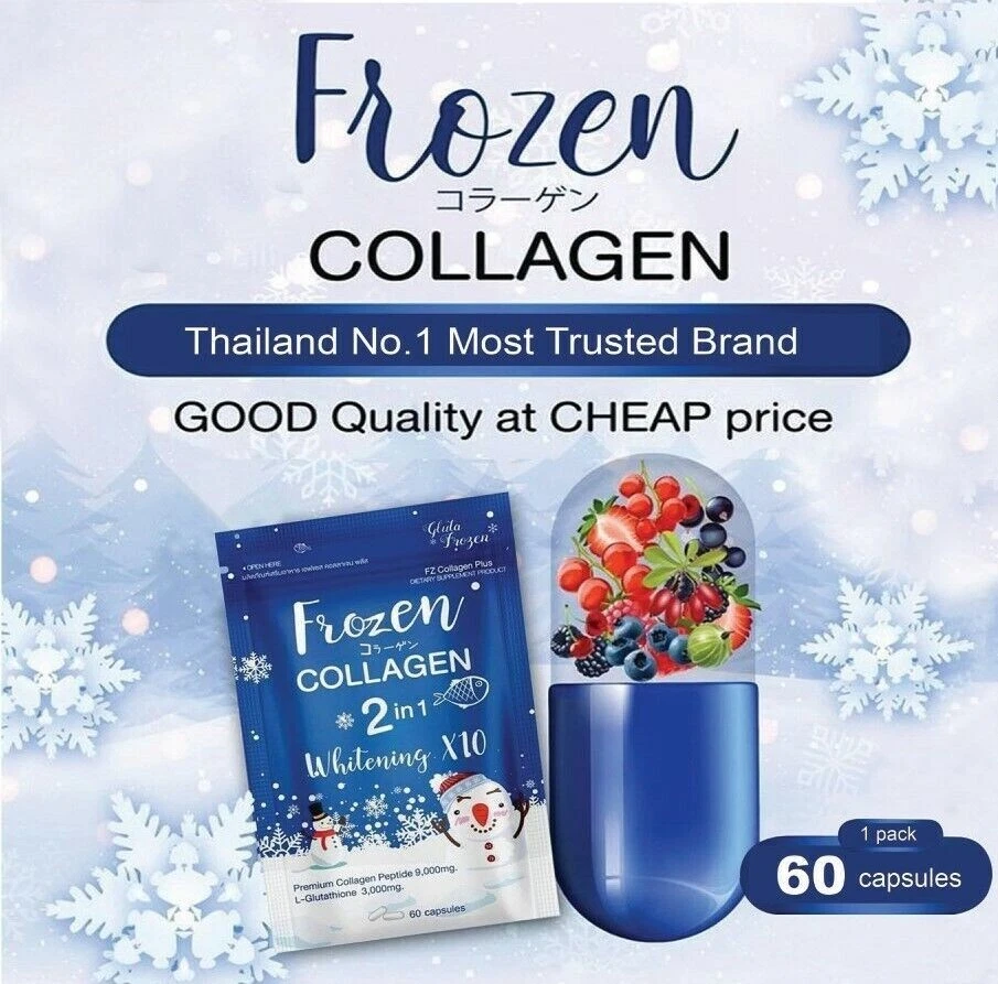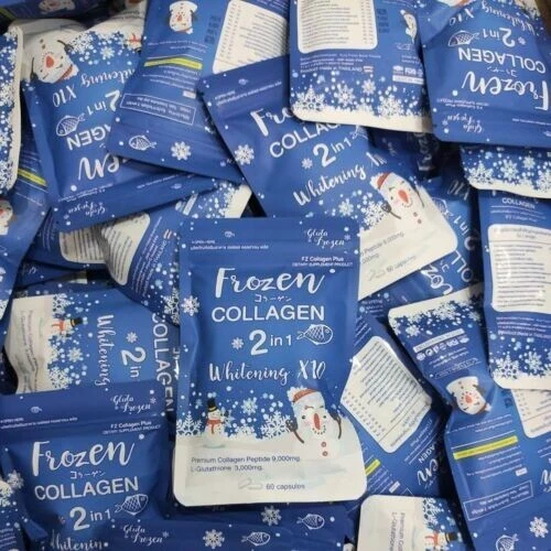 Frozen Collagen by Gluta Frozen is the revolution for clear skin with benefits of new collagen for natural radiant and pinkish-looking skin. With the ultimate well-selected 12 extracts imported from Japan, the product can nourish skin to be bright, reduce melasmas, freckles, and dark spots no the body and no the face, nourish nails and hair to be stronger, prevent skin from deterioration, and protect skin from the sunlight for healthy-looking skin all the time. Frozen Collagen Benefits: Nourishes skin to be radiant Reduces melasmas, freckles, and dark spots Reduces acne Nurtures nails and hair to be healthy Promotes skin to be moisturized and smooth Key Ingredients: Fish Hydrolyzed Collagen, L-Glutathione, Pomegranate, Coenzyme Q10, Pine Bark Extract, Ascorbic Acid, Vitamin E, Strawberry, Blueberry, Raspberry, Grape How to take frozen collagen: Take 2 capsules before bed regularly.
