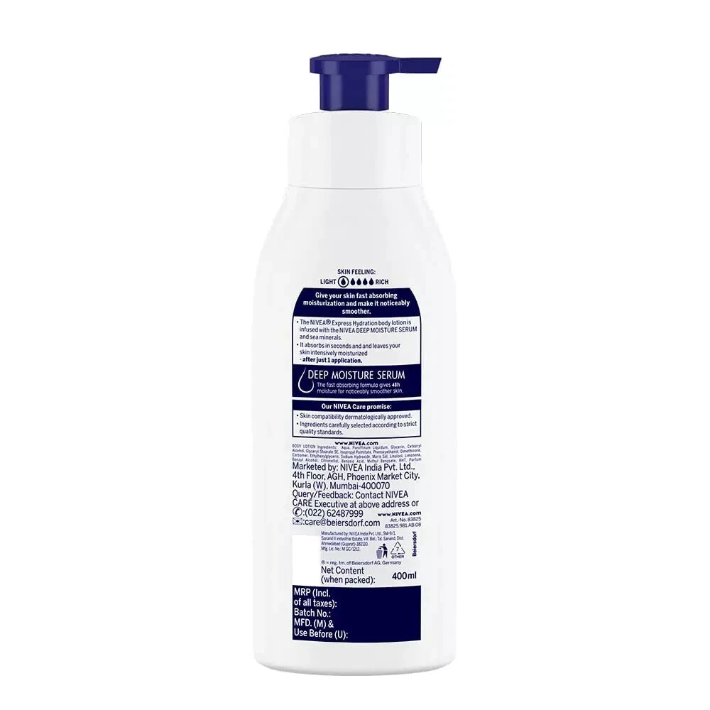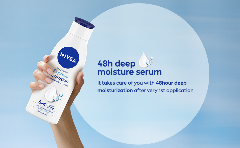 The fast absorbing NIVEA Express Hydration Body Lotion instantly delivers all the moisture needed to unveil long-lasting soft and supple skin.