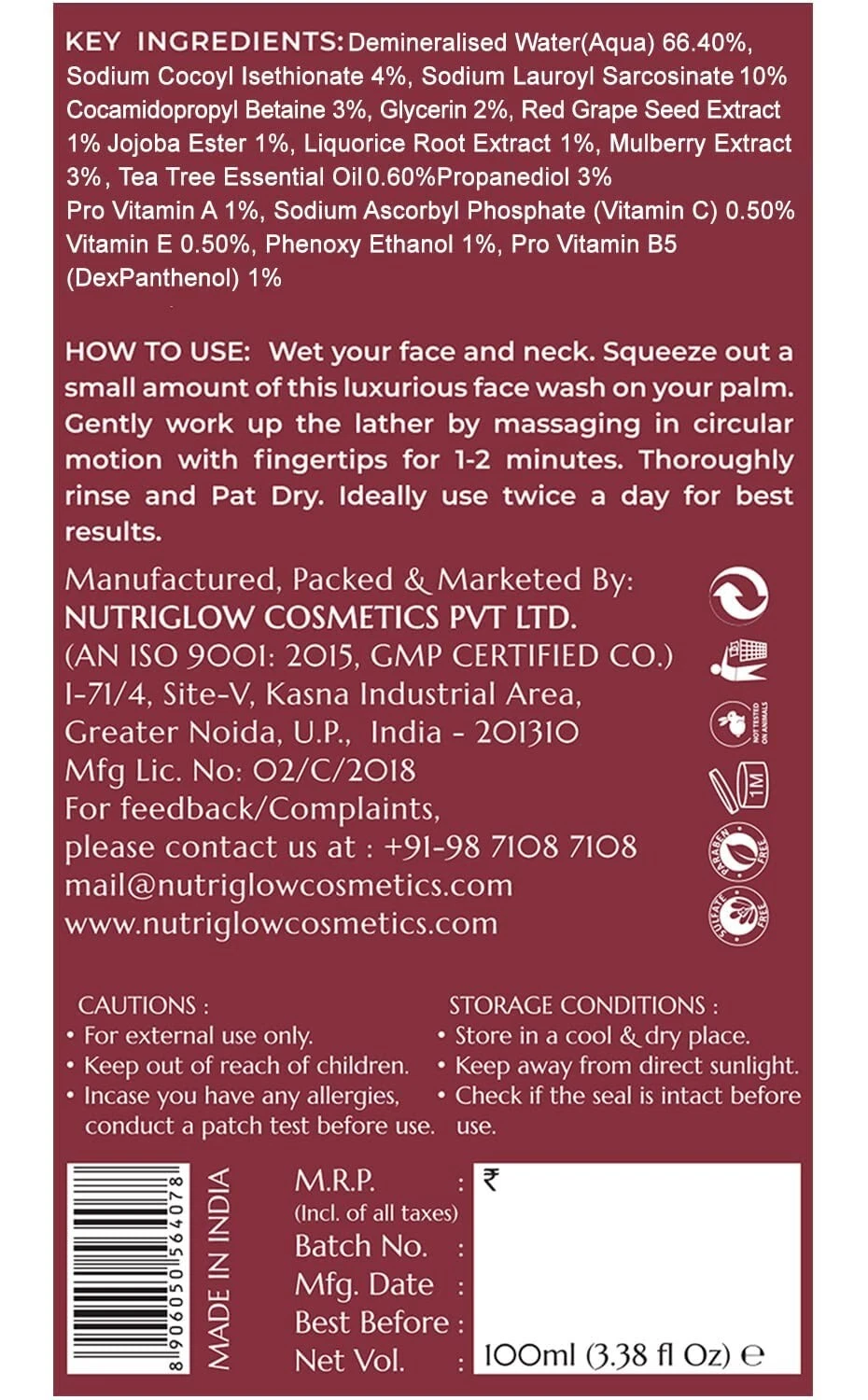 • REJUVENATED, GLOWING SKIN: Has your skin lost its radiance and glow? NutriGlow Red Wine Face Wash enhances the skin’s texture and helps in reviving your dull skin. Infused with Red Grapes Extract, it helps in providing instant radiance and glow to you skin