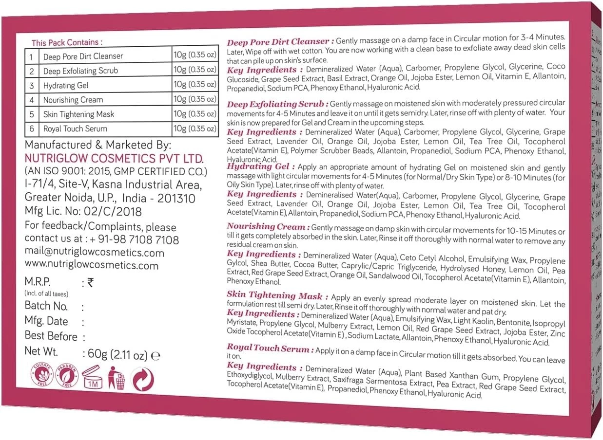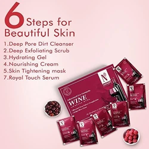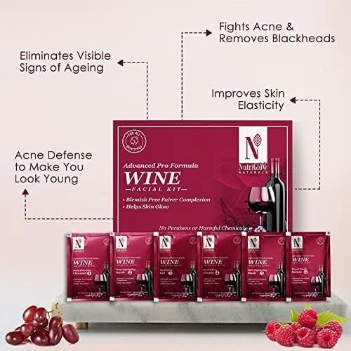 NutriGlow Wine Facial Kit contains Wine Deep Cleanser-10g, Wine Exfoliation Scrub-10g, Wine Nourishing Gel-10g, Wine Whitening Cream-10g, Wine Firming Mask Pack-10g & Wine Serum-10ml which is suitable for both oily & dry skin. Packed with the graciousness of Red Wine & world-class beauty enhancers, our Wine Facial Kit is qualified to help you get rid of visible signs of ageing & rejuvenates your skin to give long-lasting glowing skin. Red Wine Toner, which contains grape extracts, the key ingredient of red wine. Red wine is also known as the Red Elixir of Youth. The cooling blend is made from Red Grape seeds revered since antiquity for its calming and hydrating benefits, which works to remove impurities and clarify the complexion for healthier-looking skin. Regular use after cleansing imparts a healthy-looking glow. Benefits: 1. Soothes & Calms Skin- Our Wine Facial Kit has soothing & calming properties that increases the elasticity of the skin. Also, it gently increases the radiance by wiping out the impurities from your skin & makes you look picture-perfect. 2. Hydrates & Nourishes Skin- All the beauty enhancers in our wine facial kit are prepared with Red Grape extract which is also known for its hydrating properties apart from making you age better. It will not merely keep your skin moisturized but also will allow your skin to attain its essential oils which will make you even more beautiful. 3. Fights Acne & Removes Blackheads- Wine Deep Cleanser & Wine Exfoliation Scrub in the pack deeply cleanses & exfoliates dead skin. It gently removes blackheads and eradicates scum from the skin therefore, prevents acne & pimples from popping on your beautiful skin. 4. Eliminates Visible Signs of Ageing- The combination of Wine Firming Mask Pack & Wine Serum in this facial kit allow the skin to fight against fine lines & wrinkles. It firmly energizes the dull skin cells with antioxidants that make you age better.