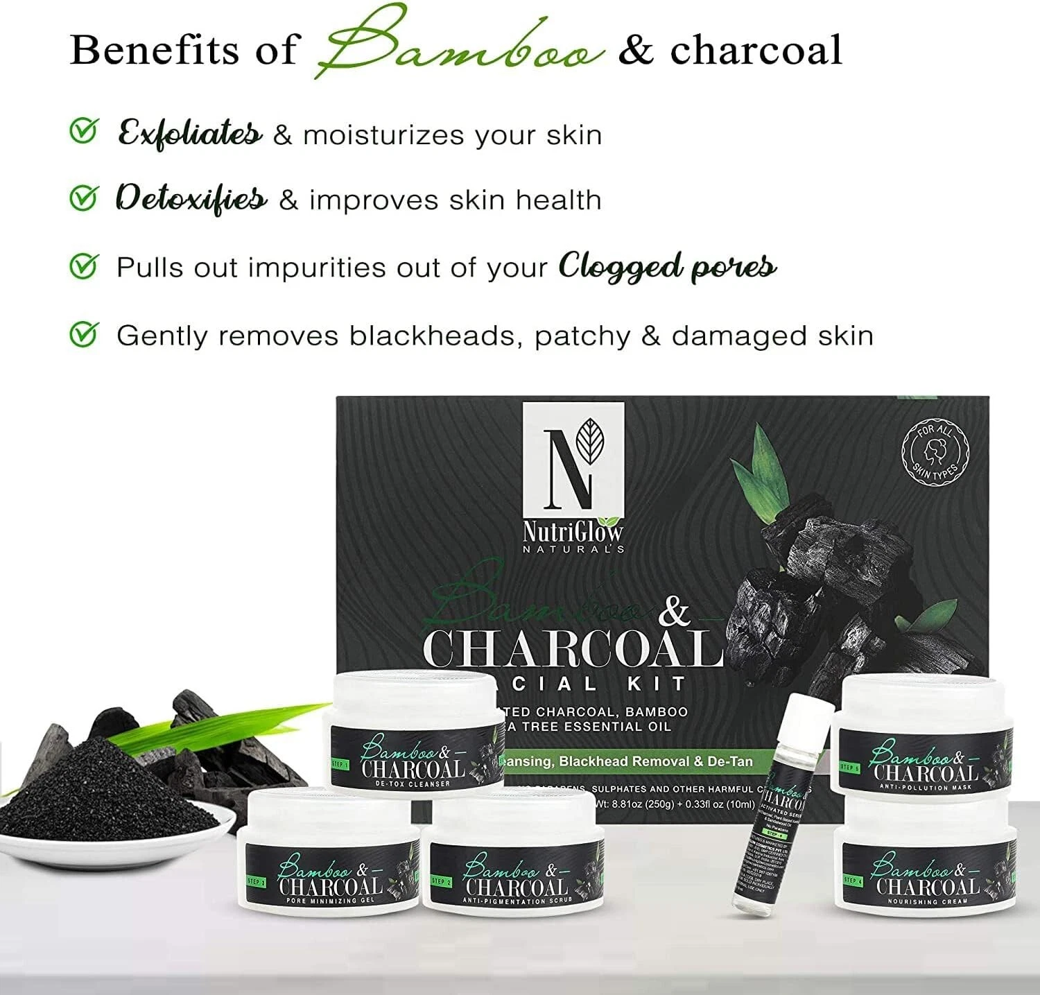 Nutriglow is here again to provide you with the purest, healthiest products and educating every individual on why organic self-care is so essential. We strive to live with compassion, kindness and empathy; to create something radically new, through our safe & potent formulas. Every ingredient that we include in our products is there for a specific therapeutic reason. We do not use fillers of any kind, meaning that almost every ingredient in our products is an “active” ingredient, resulting in pure & effective formulas. We believe in the power of nature, keeping the toxic chemicals aside and providing our valuable customers with Natural extracts and natural fragrance in our products. Most Importantly, we believe in fulfilling your wish of a healthy, rejuvenated & beautiful self, in the most caring manner we can. Pollution, dirt, harmful UV rays, and harsh weather conditions can damage your skin over time. They make your skin look dull, tanned and give it an uneven skin tone. To avoid these, your skin needs an effective but gentle facial that fights these harmful effects and gives you flawless skin. Nutriglow Facial kit, enriched with the natural goodness of real charcoal is just the thing you need! Formulated with activated bamboo charcoal, this formulation is immensely effective in enhancing the quality of the skin with its deep cleansing properties. It mildly exfoliates, cleans the toxins, dirt and oil from the skin. Apart from that, it amazingly fights and removes blackheads, unclogs impurities and helps the skin look more radiant. On the other hand, it also incredibly retains the moisture in the skin and tightens pores while brightening and smoothening the skin. Dermatologically tested, this facial kit is suitable for all skin types. It contains no harmful chemicals. Having said that, the Nutriglow Bamboo & Charcoal Facial Kit is a unique preparation and an exceptional contribution to the salon and spa industries.