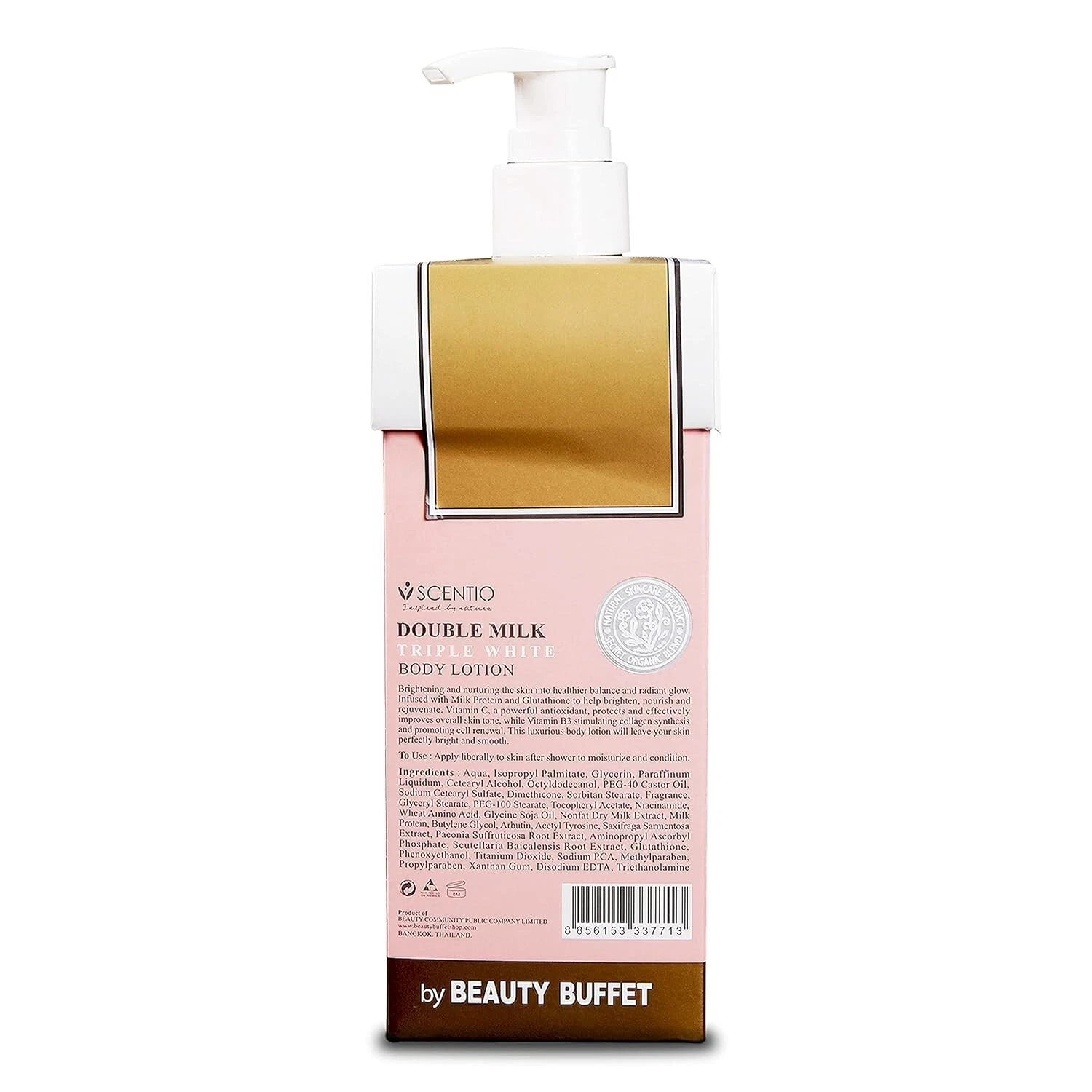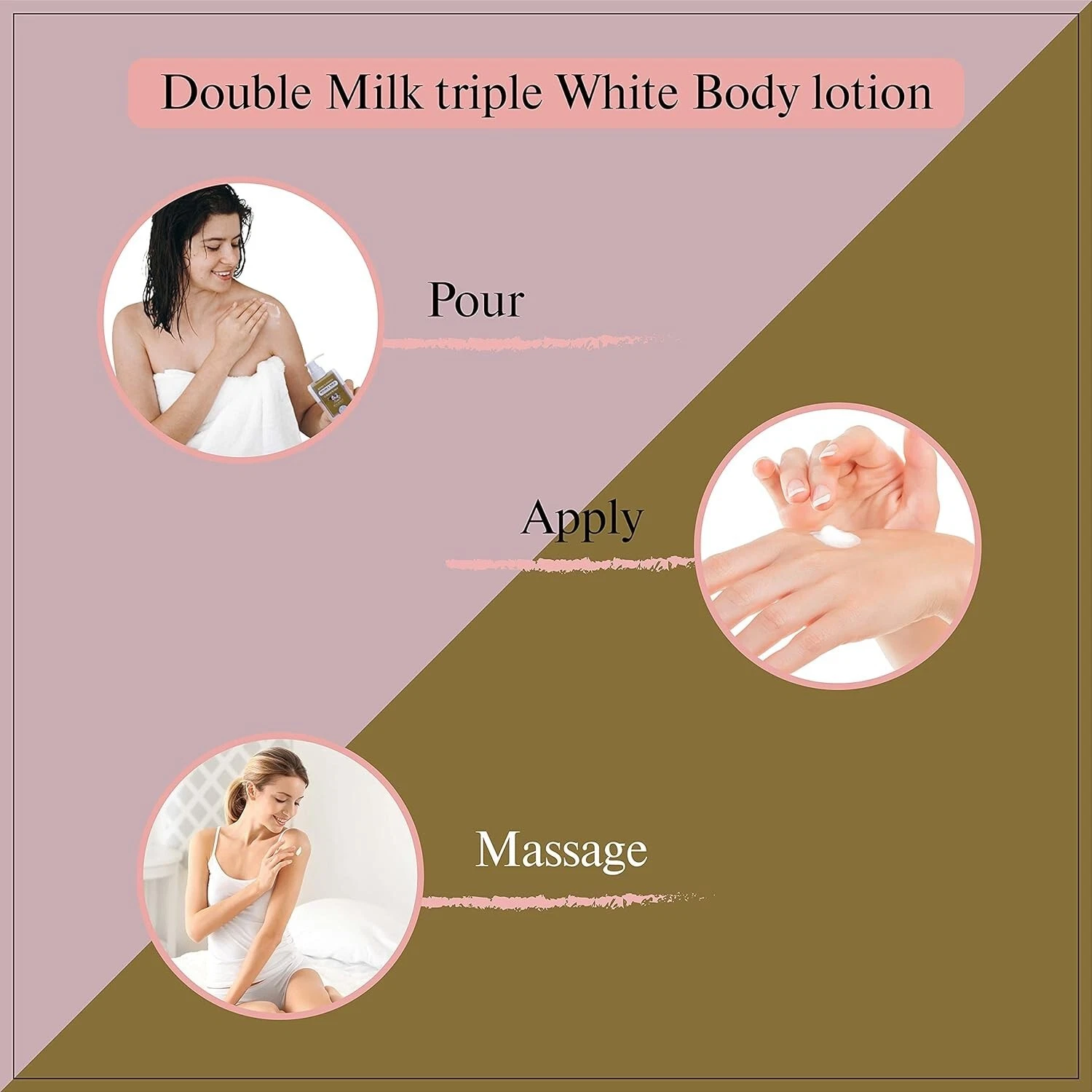 POURTAKE A LIBERAL AMOUNT ON YOUR PALMS AS NEEDED | APPLYAPPLY SCENTIO DOUBLE MILK TRIPLE WHITE ORGANIC BODY LOTION ALL OVER BODY | MASSAGEMASSAGE ACROSS YOUR BODY UNTIL FULLY ABSORBED |