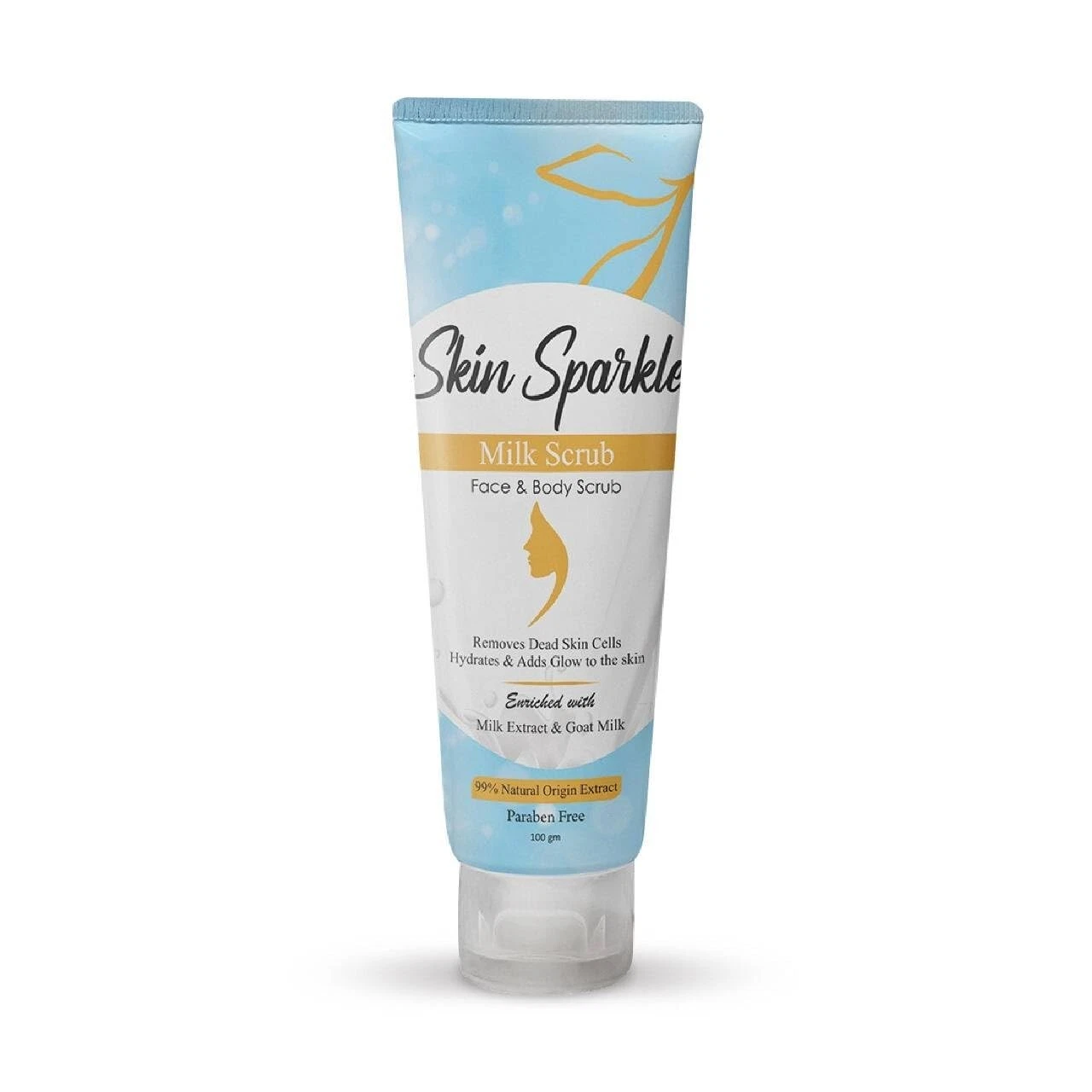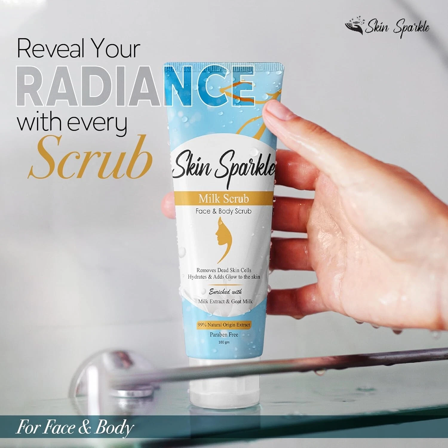 Use our Skin Sparkle Face & Body Milk Scrub to bring out the natural glow on your skin. Finely ground exfoliants are used in the formulation of this opulent exfoliating scrub to gently wipe away dead skin cells and reveal a smoother, more radiant face. Its hydrating and softening properties, enhanced by the nourishing milk proteins, leave the skin feeling smooth and renewed.Our Skin Sparkle Face & Body Milk Scrub is your go-to choice for getting soft, smooth, and luminous skin because it works for all skin types. Savor the thrill of exfoliation and witness the transformation of your skin into one that is beautiful and refreshed.