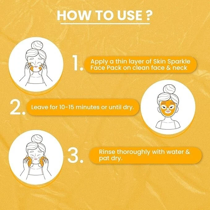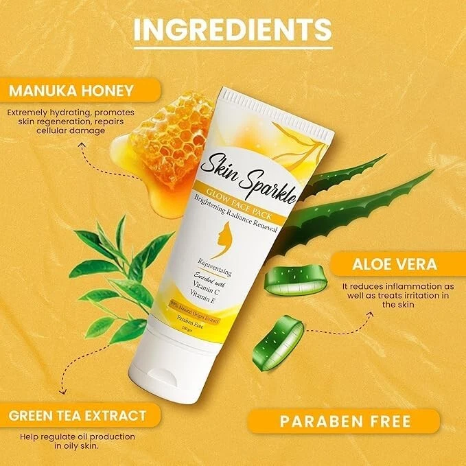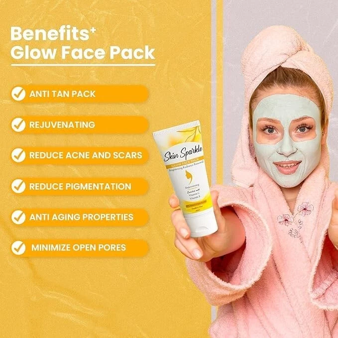With Skin Sparkle GLOW FACE PACK, a radiant discovery enhanced with vitamins C and E, you may completely change your skincare regimen. This restorative mixture is meant to bring back your skin's inherent radiance, leaving it feeling renewed and radiant. Using vitamin C, which is well-known for its brightening effects, this face mask helps to balance out skin tone and reduce dullness. In addition, vitamin E protects against environmental stresses and promotes skin suppleness by acting as an antioxidant.Skin Sparkle GLOW FACE PACK is perfect for people who want to rejuvenate their complexion because it provides an opulent, spa-like experience at home. Its smooth, creamy texture spreads easily and leaves your skin feeling hydrated and nourished. Designed to revive and restore balance, this face pack is suitable for all skin types—oily, combination, or dry. As you indulge in this soothing ritual, enjoy the delicate yet stimulating smell. Anticipate a noticeable enhancement in the texture, clarity, and brightness of your skin with continued use. Bid farewell to skin that appears worn out and welcome to a refreshed, youthful sheen.