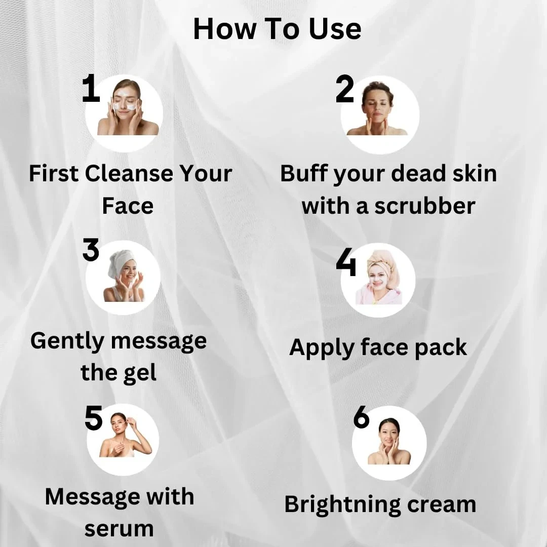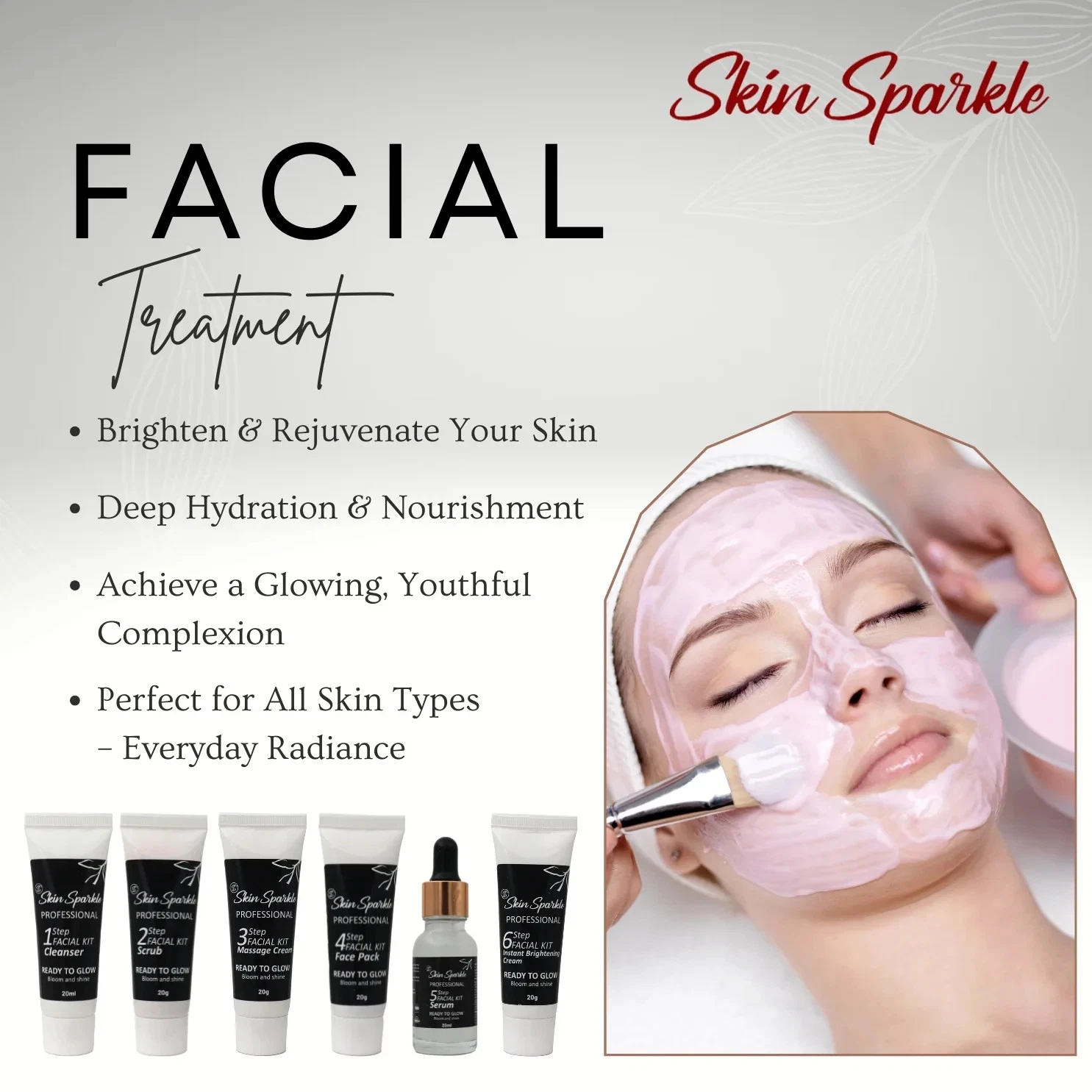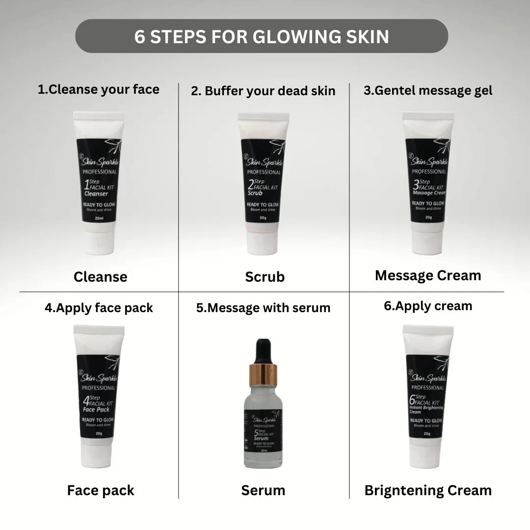 Skin Sparkle Professional 6-Step Facial Kit | Cleanser, Scrub, Massage Cream, Face Pack, Serum & Instant Brightening Cream | Deep Cleansing, Hydration & Glow | For All Skin Types | Paraben-Free
