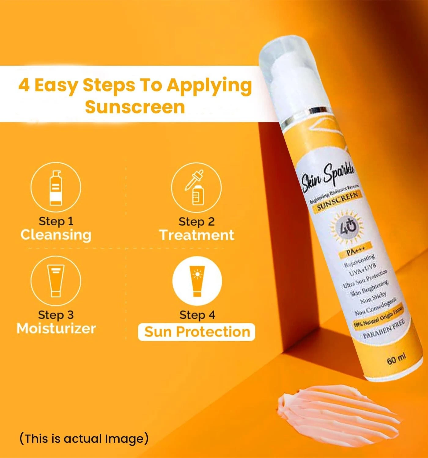 Experience the ideal combination of radiant beauty and sun protection with Skin Sparkle Sunscreen, now in SPF 30 and SPF 40. Our cutting-edge composition provides broad-spectrum defense against UVA and UVB radiation, protecting your skin from damaging sun exposure and leaving it with a radiant, dazzling sheen.The best defense against the sun's harmful rays is Skin Sparkle Sunscreen, which also makes skin appear radiant. This high-tech sunscreen is expertly made to nurture and enhance your skin's inherent beauty while shielding it from UV rays. With a strong blend of skin-friendly ingredients and broad-spectrum SPF protection, Skin Sparkle Sunscreen provides trustworthy defense against UVA and UVB rays.