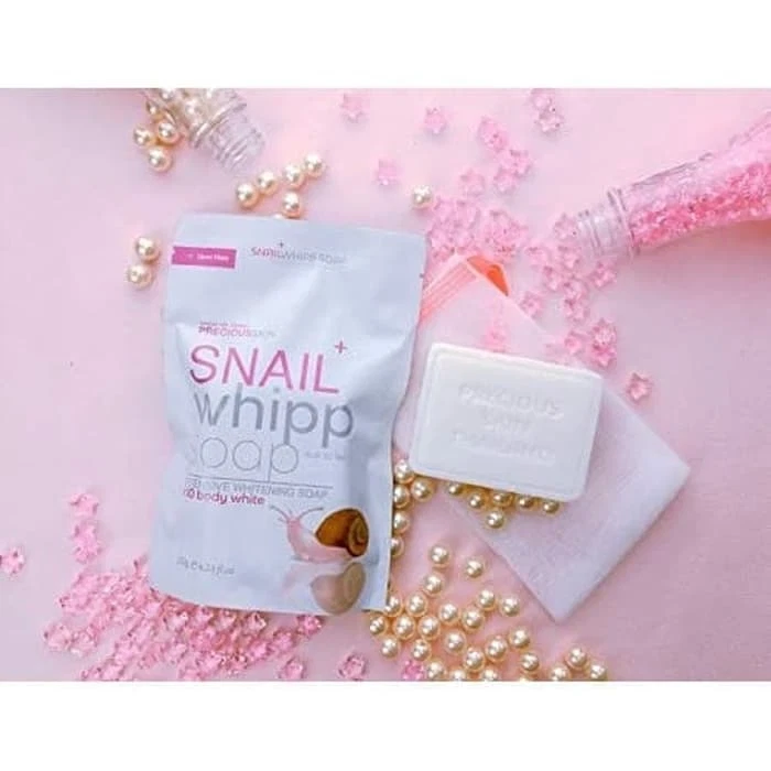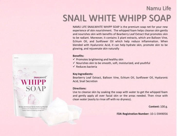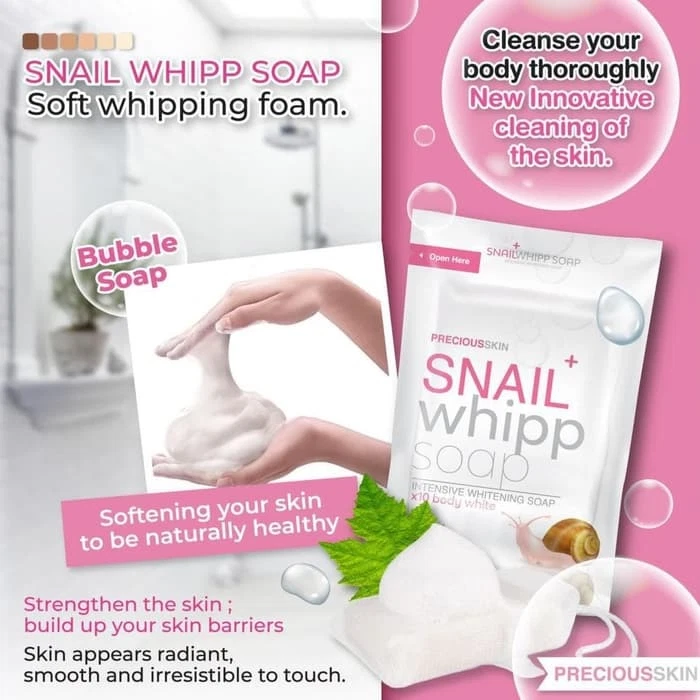 Product Overview: Snail Whipp Soap Intensive Whitening x10 is a body soap designed to promote skin whitening and improve overall skin texture. Here is a detailed description of the product: