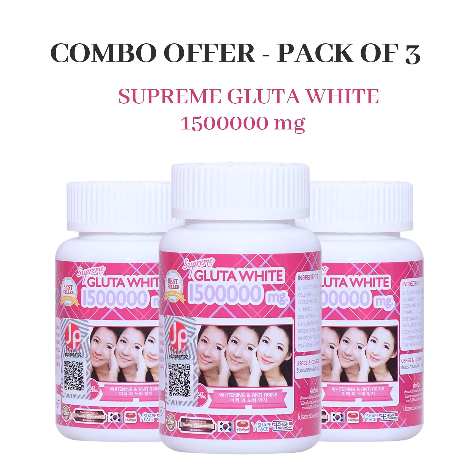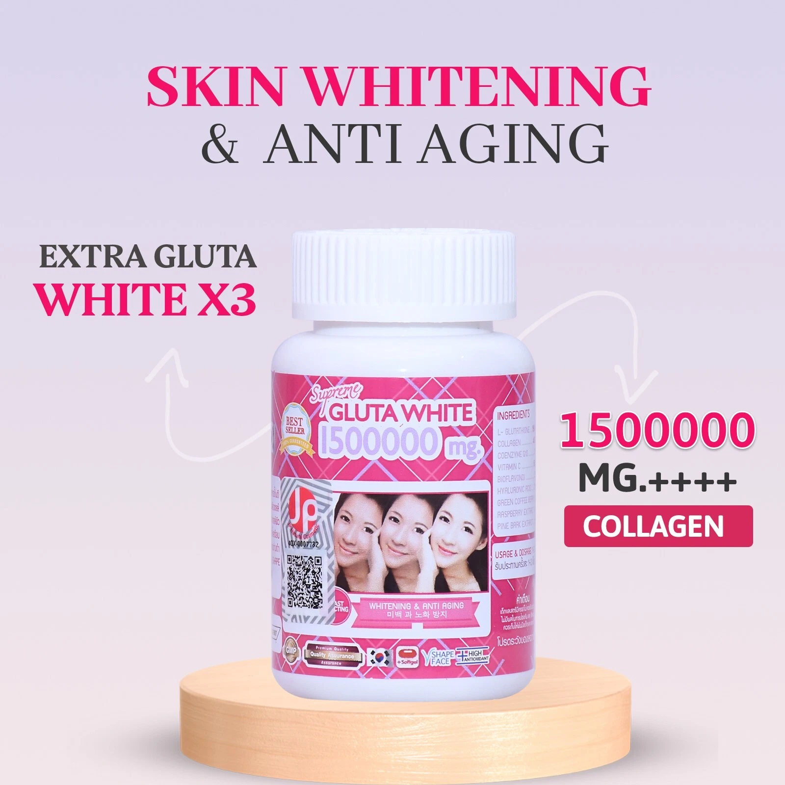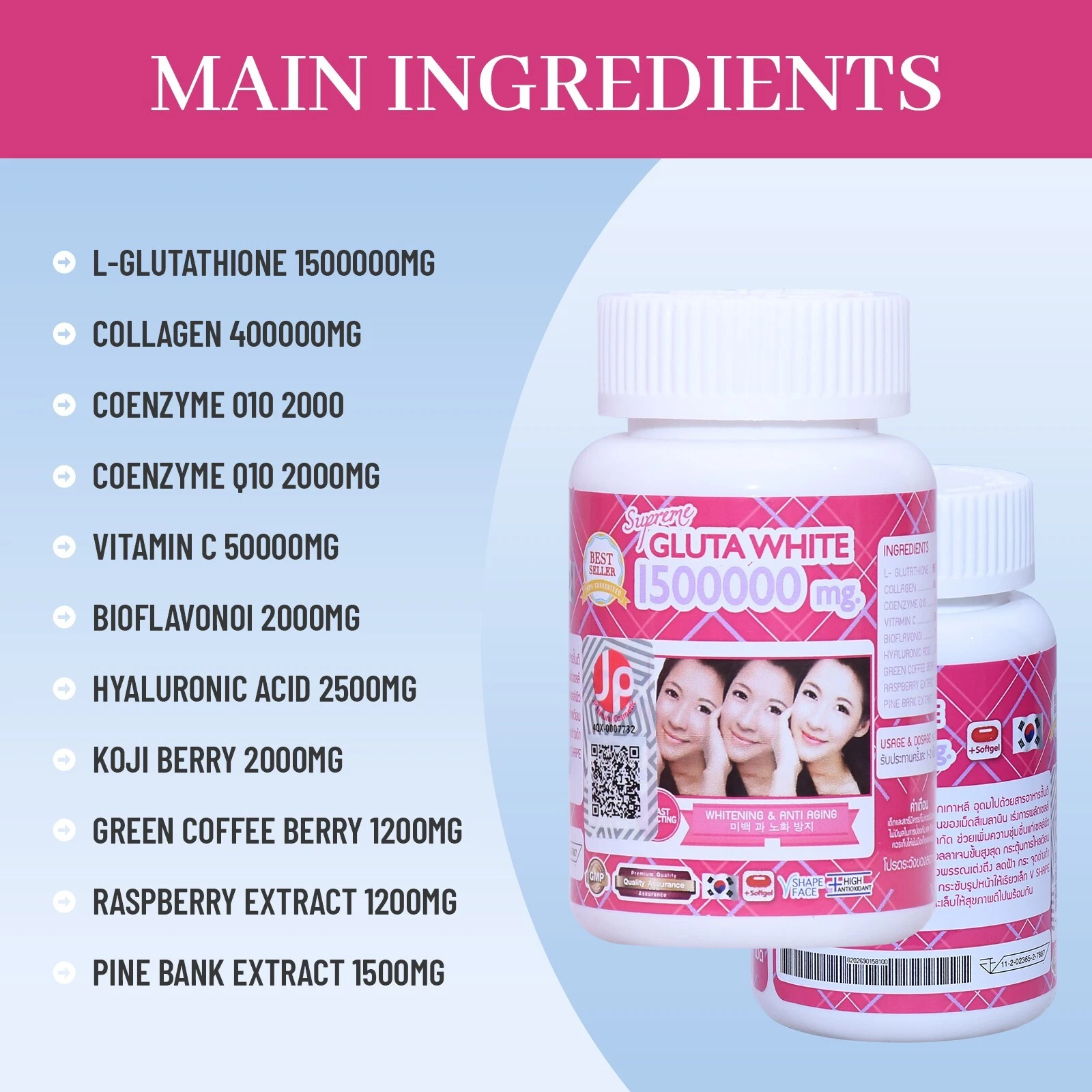 L-Glutathione 1500000mg, Collagen 400000mg, Coenzyme Q10 2000mg, Vitamin C 50000mg, Bioflavonoi 2000mg, Hyaluronic Acid 2500mg, Koji Berry 2000mg, Green Coffee Berry 1200mg, Raspberry Extract 1200mg, Pine Bank Extract 1500mg