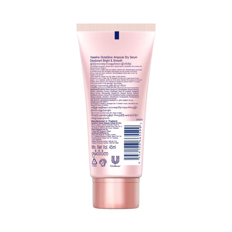 Vaseline Deo Dry Serum Bright & Smooth Visibly Whiter and Smooth Underarm is designed for individuals seeking both effective deodorant protection and improvements in the appearance and texture of their underarm skin. By combining brightening and moisturizing ingredients in a quick-absorbing dry serum formula, this product offers a comprehensive solution for maintaining healthy and attractive underarms.