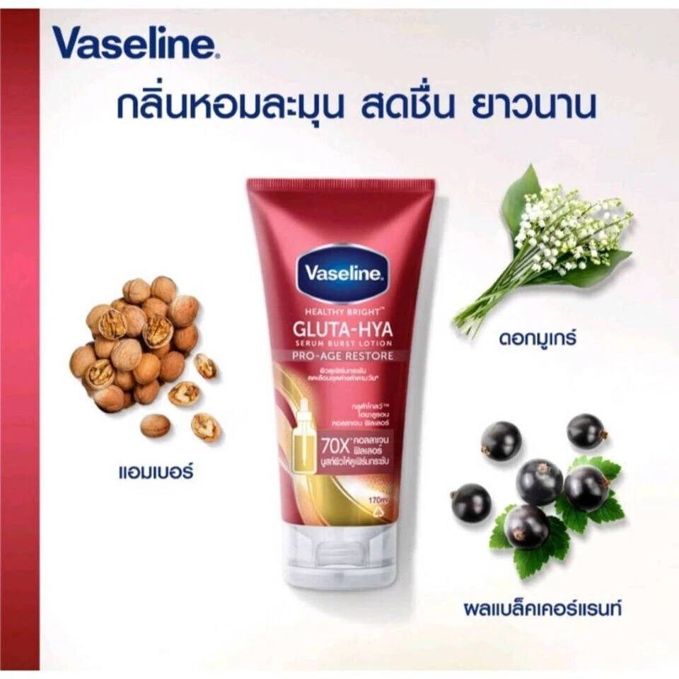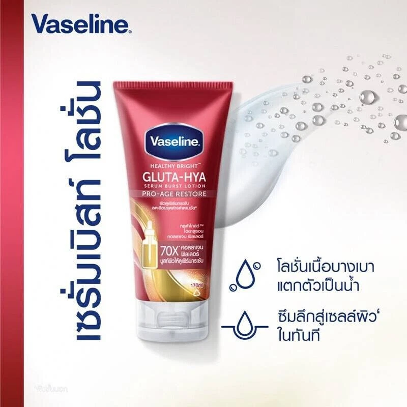 Vaseline Gluta-Hya Pro-Age Restore - Intensive Skin Rejuvenation and Hydration , Size 300 ml , ( Pack Of 1 ). Vaseline Healthy Bright Gluta-Hya Serum Burst Lotion Pro-Age Restore, which smooths and firms skin while reducing age spots.Experience the ultimate skin rejuvenation with Vaseline Gluta-Hya Pro-Age Restore, a powerful formula designed to restore your skin's youthful vitality. This advanced skincare solution combines the nourishing benefits of Glutathione and Hyaluronic Acid to deeply hydrate, revitalize, and smooth your complexion.Address the signs of aging early on with the power of high performing ingredients. This unique formula bursts into water droplets and is instantly absorbed deep into your skin cells. Experience skin that is smoother, firmer and even-toned. How To Apply: Apply the lotion twice a day all over your body.