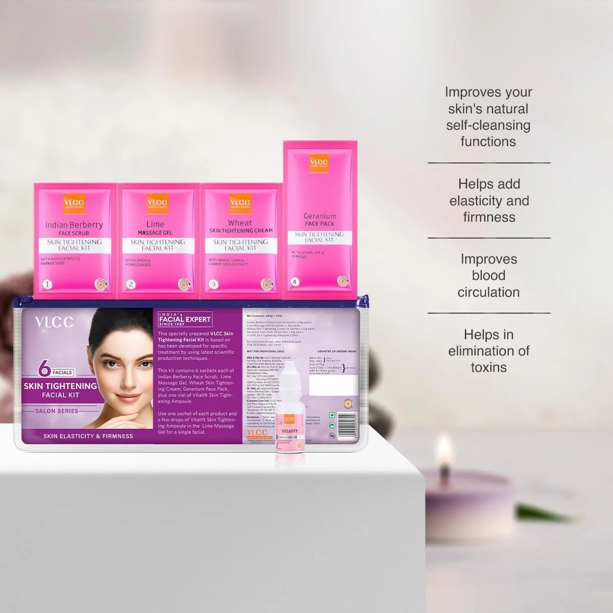 VLCC Skin Tightening Facial helps you rejuvenate your skin and give it the tightening lift. This kit contains products that help in reducing fine lines and wrinkles while delivering a firming effect. It naturally heals the skin, tightens the pores and provides a smooth and supple effect to the skin. It will remove dry and dead surface cells to encourage more rapid cell turnover. Your skin will be moisturised, soft and more elastic. Firms and tightens skin Reduces signs of ageing Controls fine lines and wrinkles Smoothens skin texture