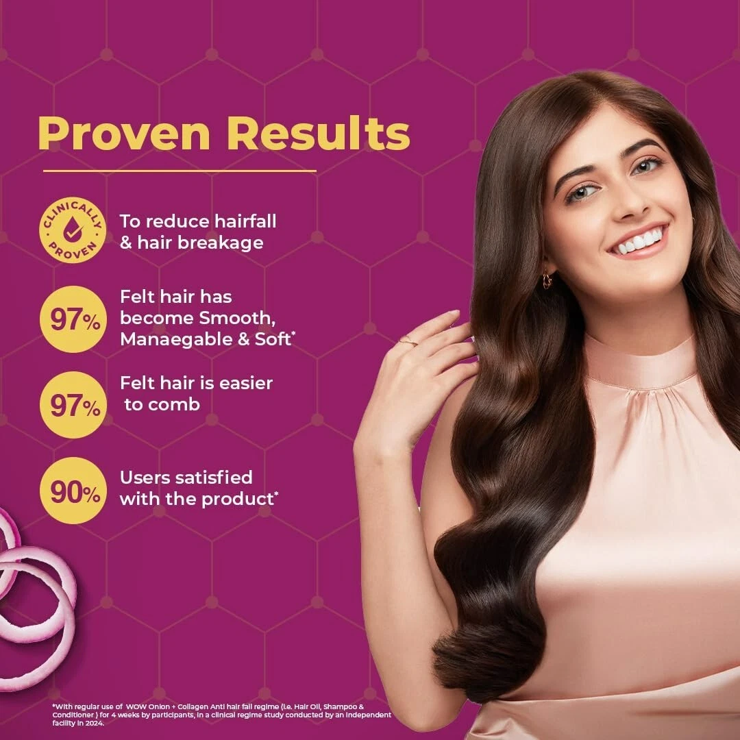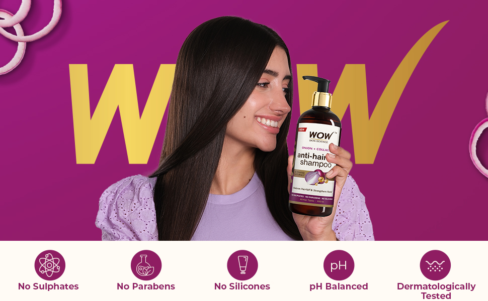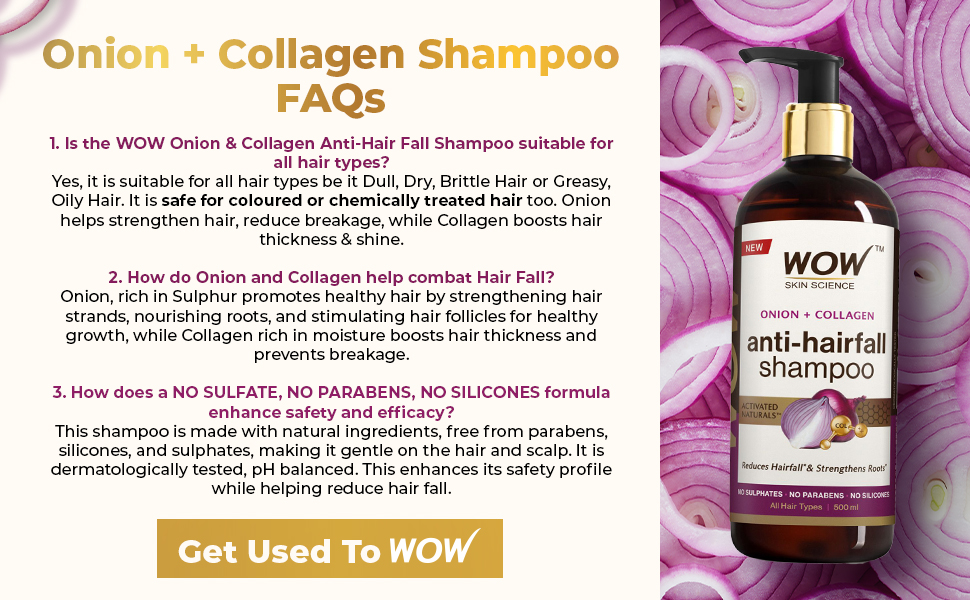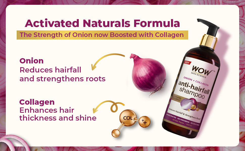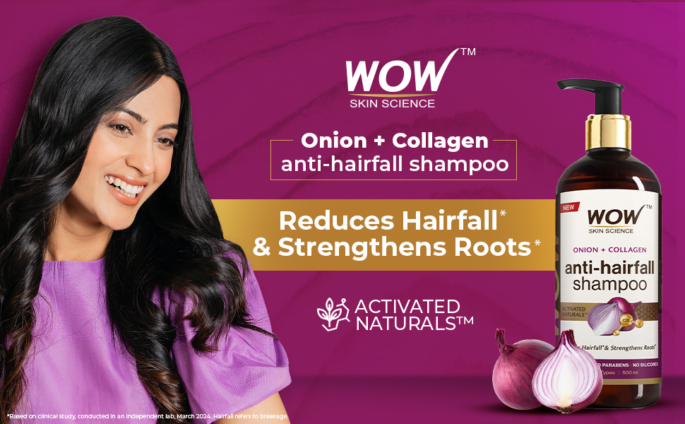 Tackle hairfall and strengthen weak hair with WOW Skin Science Onion & Collagen Anti-Hairfall Shampoo. Its Activated Naturals formula delivers the goodness of Onion enhanced with Collagen to reduce hairfall and strengthen roots. Suitable for all hair types. Onion helps strengthen roots from scalp thus helping reduce hairfall and Collagen helps enhance hair thickness and shine, protecting against breakage. The Onion seed extract in this shampoo has strong antioxidant properties that help protect the scalp and hair, promote blood circulation to the roots which strengthens the roots and follicles. Collagen has amino acids that fortify the keratin structure of hair which improves hair strength. This prevents breakage, split ends leading to reduced hairfall. Regular use ensures strong, shiny, voluminous and healthy-looking hair. "- Helps to reduce hairfall and strengthen roots - Moisturizes dull, brittle hair boosting shine and smoothness - Anti-hairfall shampoo suitable for all hair types - Can be used three times a week to reduce breakage - Gives strong, lustrous and voluminous hair - Dermatologically tested | pH Balanced - Free from Sulphates, Parabens and Silicones