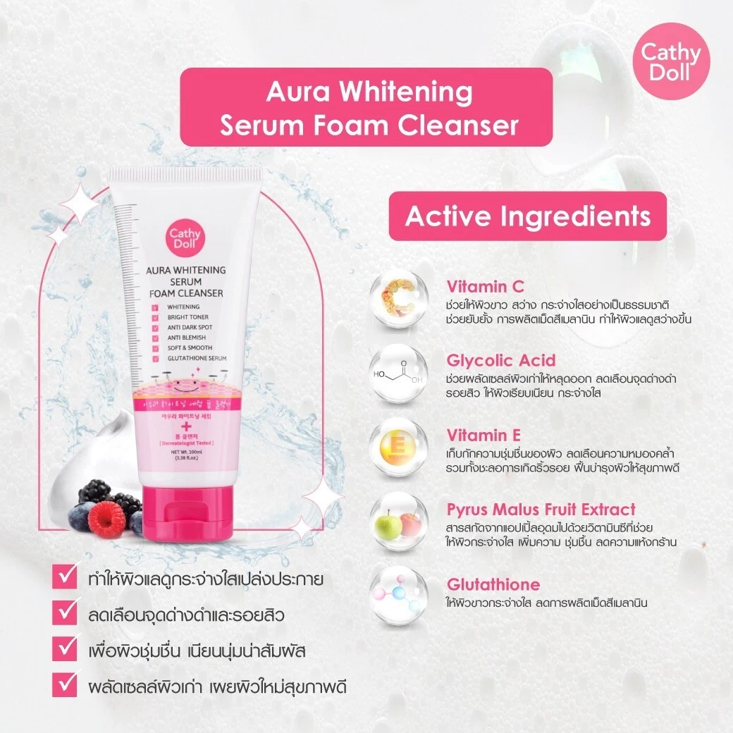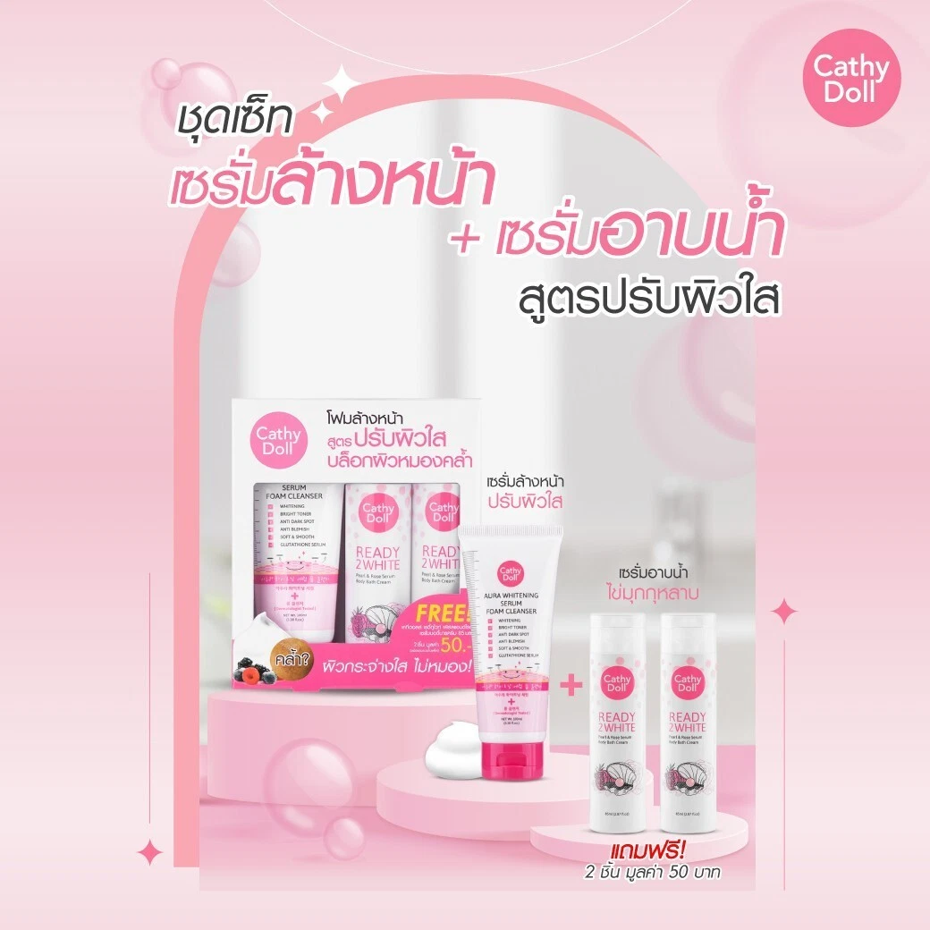 Description: Aura Serum Foam 100ml + Pearl and Rose Body Bath Cream 85ml 1pc + 1pc FREE Rose Body Bath Cream 85m 1. Cathy Doll Aura Whitening Serum Foam Cleanser 100ml Combining serum to wash your face that comes with nourishment. Helps reduce and prevent dark spots to make your face white, clear, glowing like aura. Ready to provide softness and smoothness to the touch. How to use: Squeeze the foam onto the palm of your hand, rub gently over the face and rinse. 2. Cathy Doll Pearl and Rose Serum Body Bath Cream 85ml 2 pieces Combining the effectiveness of pearl powder and rose water Helps to remove dead skin cells and gently cleanse the skin. But it does not dry out the skin, it also helps to reduce dullness, slow down the aging of time and maintain moisture to the skin. How to use: Squeeze a moderate amount of shower cream onto the palm. Use to scrub the body while the skin is wet. Then rinse with clean water . Should be used continuously
