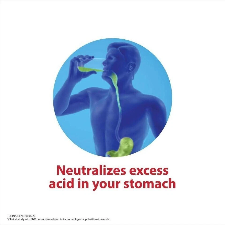 Acidity can be associated with a range of issues like stomach discomfort, bloating, pain, acid reflux and heartburn. Thankfully, relief from acidity can arrive fast with Eno. Eno is India’s No 1 Antacid Brand. Eno Antacid provides fast relief from acidity & gets to work in 6 secs by neutralizing excess stomach acid upon contact. Based on lab studies, Eno powder works faster than leading liquid and tablet antacids. Nothing is better for fast relief from acidity and heartburn than Eno. Eno is available in 100gm Bottles and 5gm sachets which come in a handy box of 6 sachets.