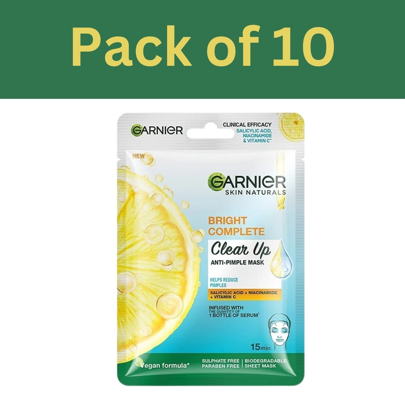 Garnier Bright Complete Anti Pimple Sheet Mask -Infused With Power of 3 serums, Salicylic Acid, Niacinamide and Vitamin C Serum,Face Sheet Mask For Clear, Hydrated And Glowing Skin, for All Skin Types