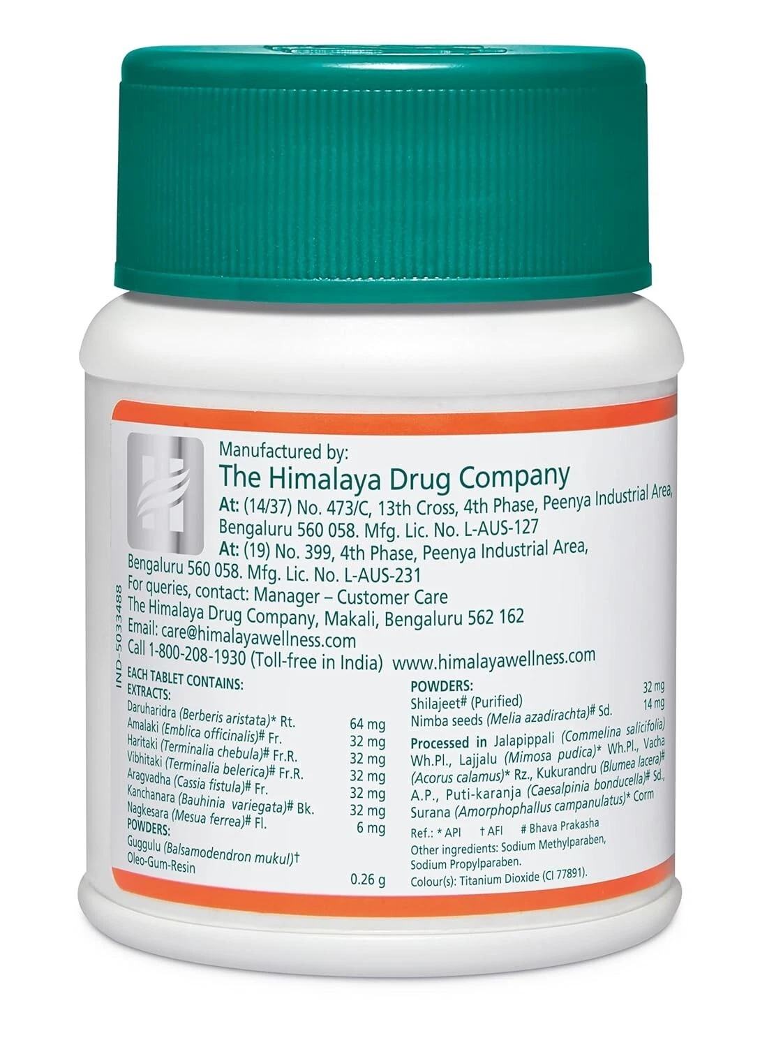 Ingredients: - balsamodendron mukul 0.26 gm, melia azadirachta 14 mg, berberis aristata 64 mg, emblica officinalis 32 mg, terminalia chebula 32 mg, terminalia belerica 32 mg, cassia fistula 32 mg, bauhinia varicgata 32 mg, mesua ferrea 6mg.
