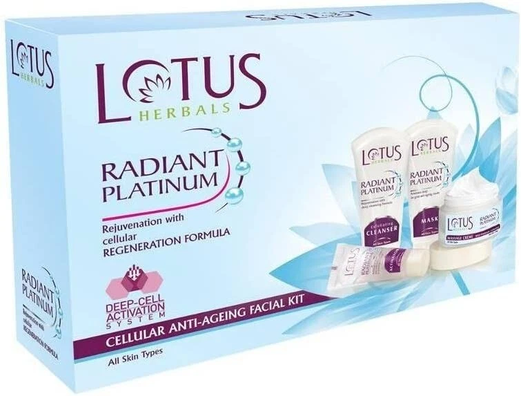 Lotus herbal introduces its top notch RADIANT PLATINUM Cellular Anti-Ageing 1 FACIAL KIT, which is a single use facial kit and comes in a sachet that includes Radiant Platinum Exfoliating Cleanser, Radiant Platinum activator, Radiant Platinum Massage Creme and Radiant Platinum Mask, which give you a tantalizing glow with a dreamy softness.