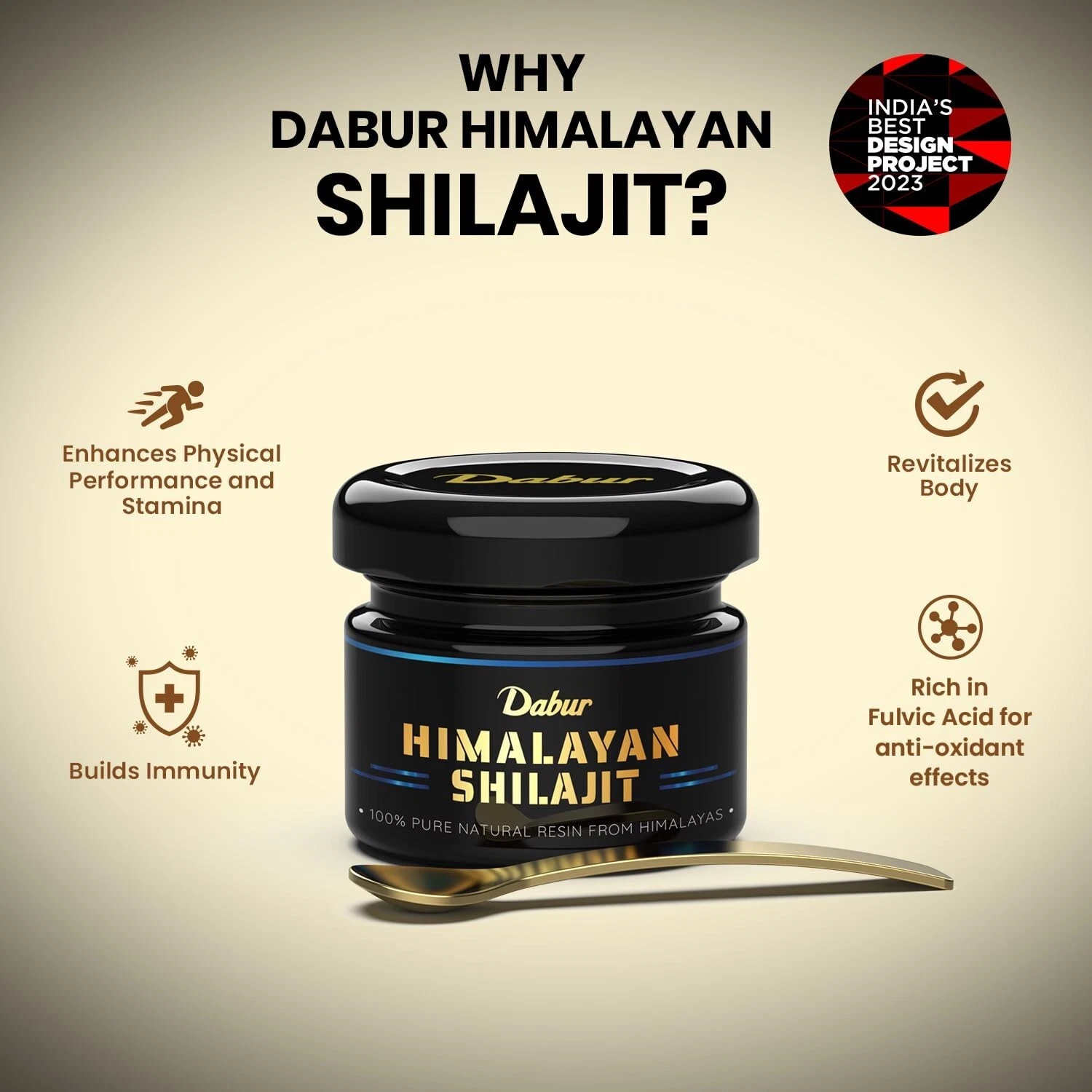 Dabur Himalayan Shilajit is 100% Pure, Natural extract from Himalayas, that helps fight fatigue and improves immunity; Relieves stress and anxiety; strenghtens bones and muscles; Builds stamina; and Supports healthy ageing