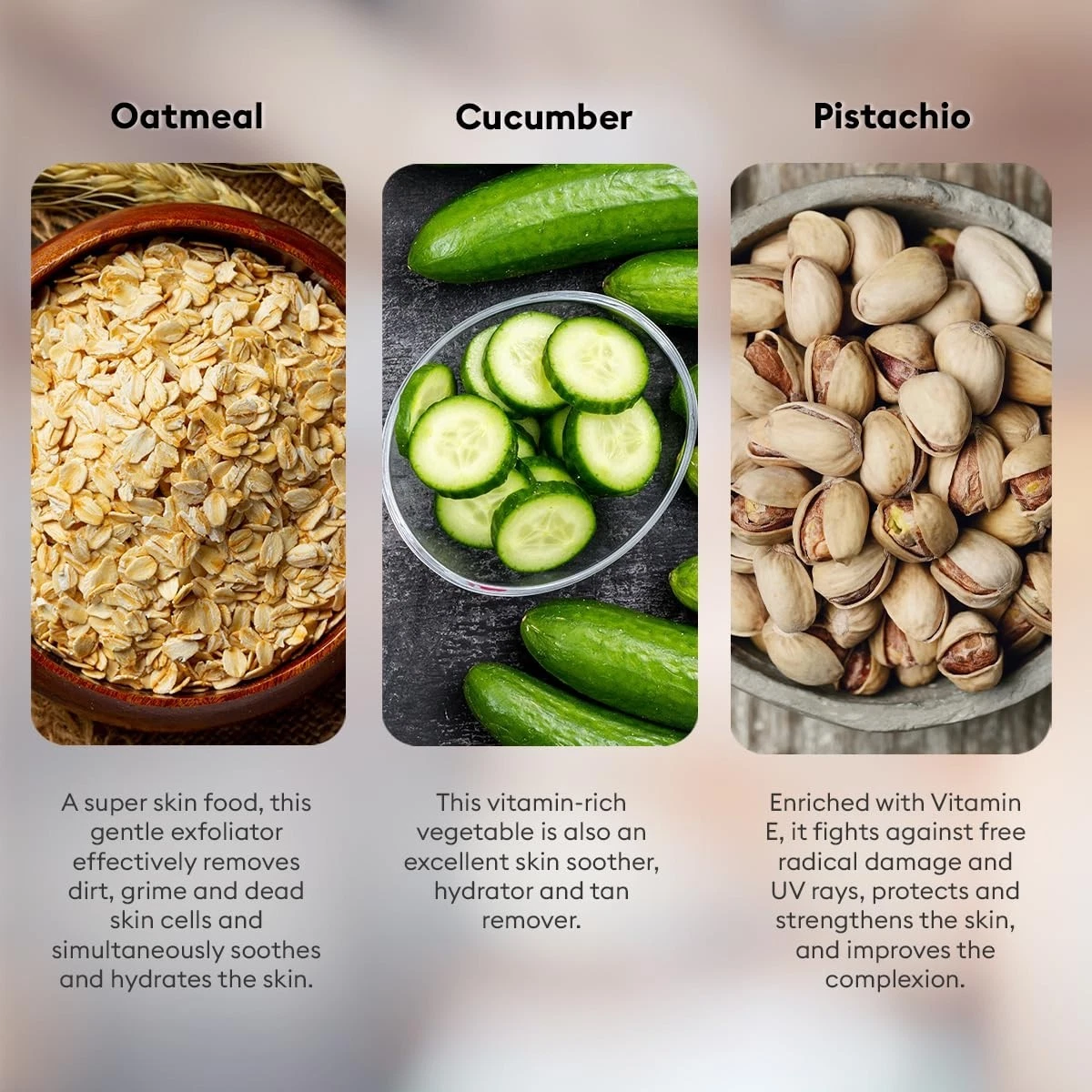 Oatmeal: A super skin food, this gentle exfoliator effectively removes dirt, grime and dead skin cells and simultaneously soothes and hydrates the skin. Cucumber: This vitamin-rich vegetable is also an excellent skin soother, hydrator and tan remover. Pistachio: Enriched with Vitamin E, it fights against free radical damage and UV rays, protects and strengthens the skin, and improves the complexion.